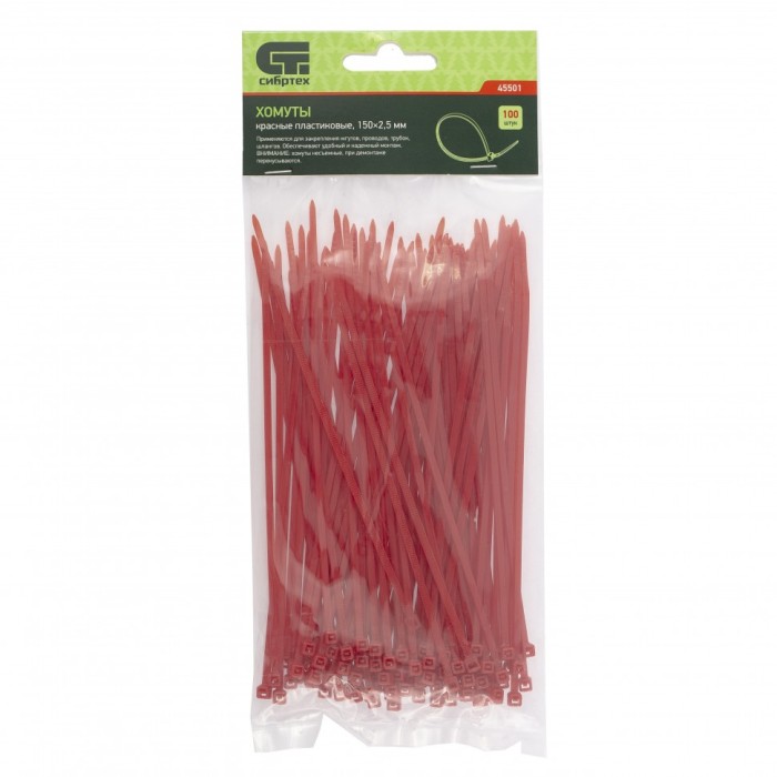 Красные пластиковые хомуты Сибртех 45501, 150 х 2,5 мм, 100 шт. в упаковке, используются для стяжки кабелей, закрепления трубок, шлангов, рекламных конструкций, а также для упаковки различных предметов. Пригодятся во вре...