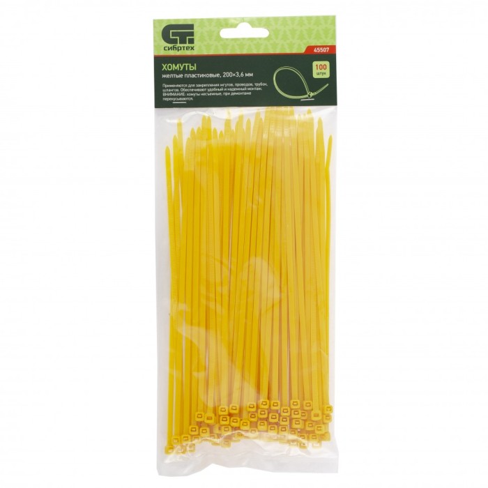 Желтые пластиковые хомуты Сибртех 45507, 200 х 3,6 мм, 100 шт. в упаковке, используются для стяжки кабелей, закрепления трубок, шлангов, рекламных конструкций, а также для упаковки различных предметов. Пригодятся во врем...