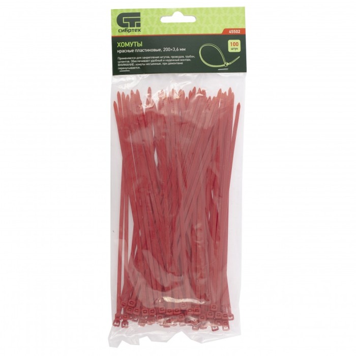 Красные пластиковые хомуты Сибртех 45502, 200 х 3,6 мм, 100 шт. в упаковке, используются для стяжки кабелей, закрепления трубок, шлангов, рекламных конструкций, а также для упаковки различных предметов. Пригодятся во время прокладки электрических и локальных вычислительных сетей, ремонта компьютерной техники, оформлении торговых стендов, комплектовании товара, будут также полезны дома, на даче и в гараже.ПреимуществаНадежные соединения — кабельные стяжки изготовлены из прочного нейлона.Возможность проведения наружных работ — хомуты устойчивы к ультрафиолету и сохраняют свои свойства при температуре от -35 до +85 ℃.100 штук в упаковке — набора хватит надолго.