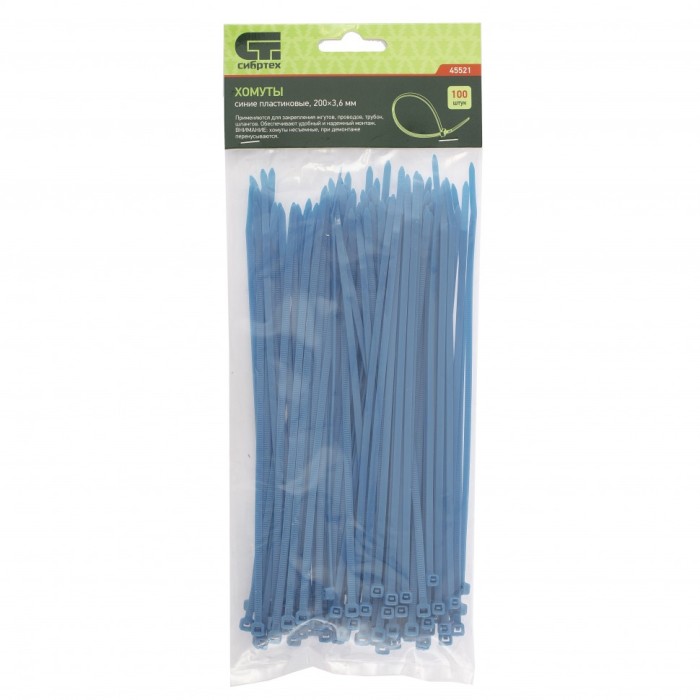 Синие пластиковые хомуты Сибртех 45521, 200 х 3,6 мм, 100 шт. в упаковке, используются для стяжки кабелей, закрепления трубок, шлангов, рекламных конструкций, а также для упаковки различных предметов. Пригодятся во время...