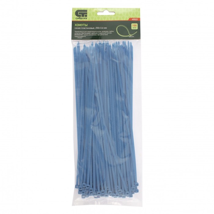 Синие пластиковые хомуты Сибртех 45522, 250 х 3,6 мм, 100 шт. в упаковке, используются для стяжки кабелей, закрепления трубок, шлангов, рекламных конструкций, а также для упаковки различных предметов. Пригодятся во время...