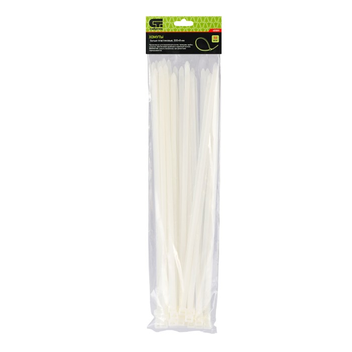 Белые пластиковые хомуты Сибртех 45589, 500 х 8 мм, 50 шт. в упаковке, используются для стяжки кабелей, закрепления трубок, шлангов, рекламных конструкций, а также для упаковки различных предметов. Пригодятся во время пр...