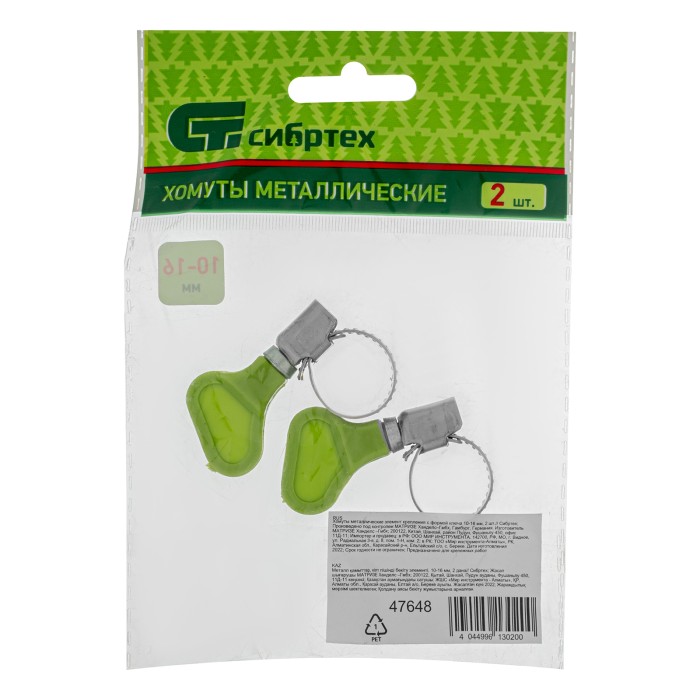 Металлические хомуты Сибртех 47648 с элементом крепления в форме ключа, с диаметром охвата 10-16 мм, 2 шт. в упаковке, используются для соединения труб и шлангов. Подходят для многократного применения. Стяжки-хомуты затя...