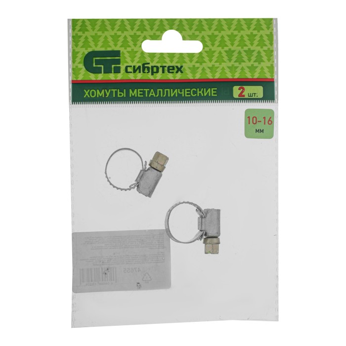 Металлические хомуты Сибртех 47655 со стандартным болтовым креплением, диаметром охвата 10-16 мм и шириной 9 мм, 2 шт. в упаковке, — крепежные элементы для соединения труб и шлангов. Обеспечивают плавную регулировку диам...