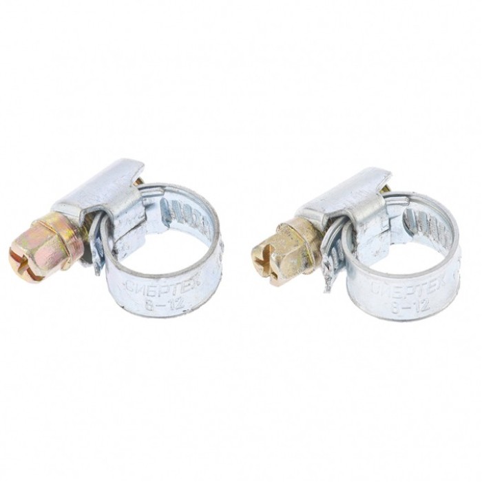 Металлические хомуты Сибртех 47656 со стандартным болтовым креплением, диаметром охвата 12-20 мм и шириной 9 мм, 2 шт. в упаковке, — крепежные элементы для соединения труб и шлангов. Обеспечивают плавную регулировку диам...