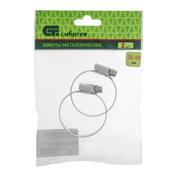 Металлические хомуты Сибртех 47660 со стандартным болтовым креплением, диаметром охвата 32-50 мм и шириной 9 мм, 2 шт. в упаковке, — крепежные элементы для соединения труб и шлангов. Обеспечивают плавную регулировку диам...