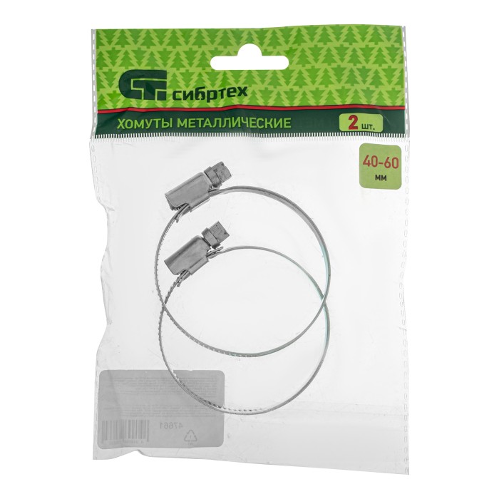 Металлические хомуты Сибртех 47661 со стандартным болтовым креплением, диаметром охвата 40-60 мм и шириной 9 мм, 2 шт. в упаковке, — крепежные элементы для соединения труб и шлангов. Обеспечивают плавную регулировку диам...