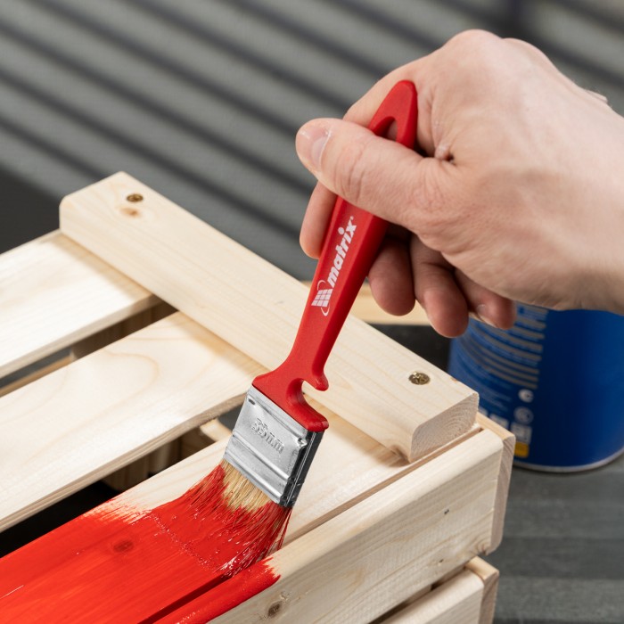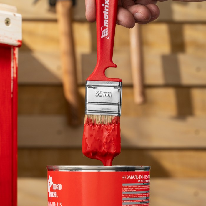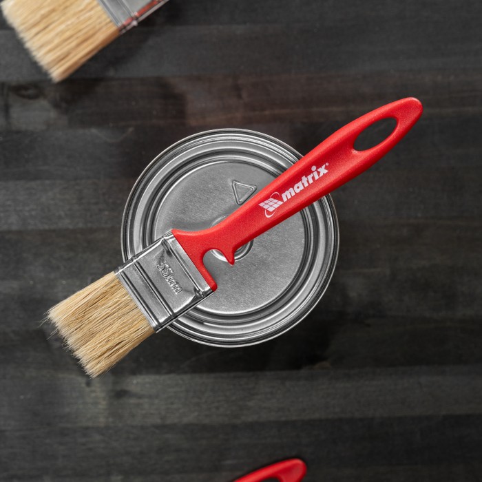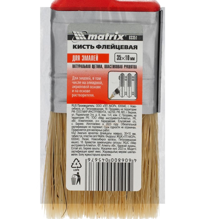 Флейцевая кисть Matrix Color Line «ЭМАЛИ» 83351 шириной 35 мм и толщиной 10 мм предназначена для работы с эмалями, в том числе на акриловой, алкидной основе, а также на основе растворителя. Натуральная щетина устойчива к износу и воздействию агрессивных жидкостей, а благодаря расщепленным концам хорошо впитывает и отдает краску. Высокая плотность щетины позволяет получить качественное покрытие. ПреимуществаРавномерное окрашивание — натуральная светлая щетина двойной выварки хорошо удерживает и распределяет краску.Долговечность — щетина надежно закреплена с помощью тщательно подобранной эпоксидной смолы, клиньев и бандажа, пластиковые клинья не деформируются при мытье или замачивании.Защита от разрушения — на бандаж нанесено антикоррозийное покрытие.Эргономичность — форма рукоятки продумана таким образом, чтобы мастер не уставал даже при длительной работе, специальный вырез позволяет зафиксировать кисть на малярном ведре или банке.Удобное хранение — в рукоятке имеется отверстие для подвешивания кисти на крючок или гвоздь.