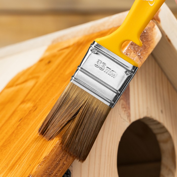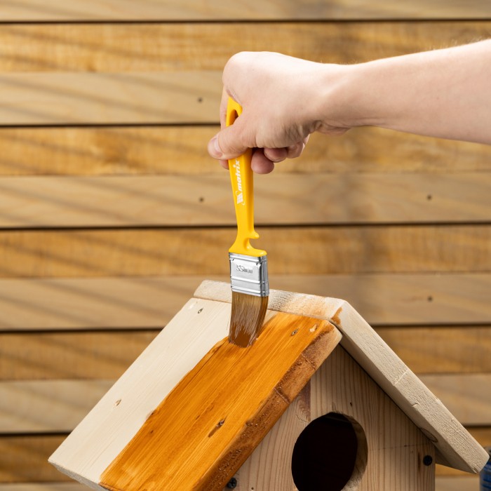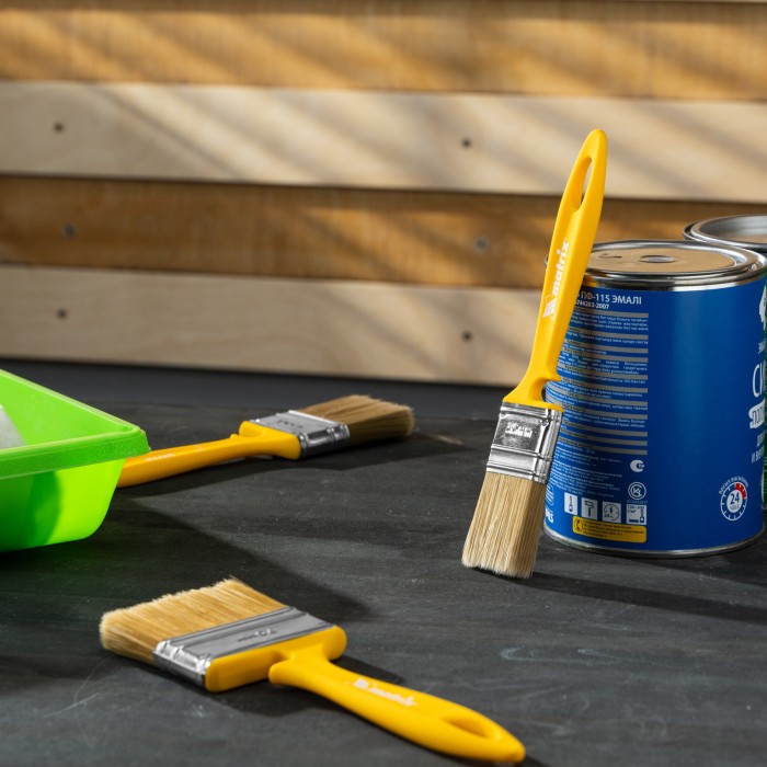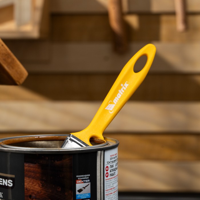 Флейцевая кисть Matrix Color Line «ЛАКИ» 83362 шириной 35 мм и толщиной 10 мм используется для отделочных работ с применением лаков на акриловой, водной и натуральной основе. Ею удобно лакировать небольшие участки. Искусственная щетина отличается повышенной упругостью, поэтому кисть обеспечивает высокое качество работ.ПреимуществаПолучение гладкого финишного покрытия — волокна щетины расщеплены на концах.Возможность многократного мытья и замачивания — клинья изготовлены из пластика, а щетина проклеена качественной эпоксидной смолой.Коррозионная стойкость — бандаж имеет защитное покрытие, благодаря которому кисть можно замачивать в воде.Комфортная работа — благодаря оптимальной форме рукоятки мастер не устает во время окрашивания.Продуманное хранение — в рукоятке имеется отверстие для подвешивания кисти, а на время перерыва в работе инструмент можно закрепить на краю ведра или банки — для этого предусмотрена специальная выемка.