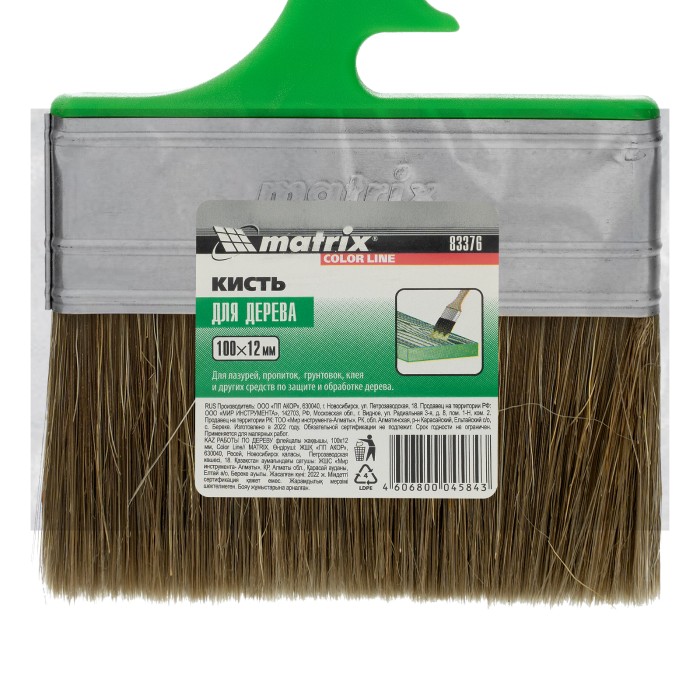 Флейцевая кисть Matrix Color Line «РАБОТЫ ПО ДЕРЕВУ» 83376 шириной 100 мм и толщиной 12 мм используется с любыми видами пропиток, клеев, грунтовок и других деревообрабатывающих составов. Комбинированная щетина расщеплена на кончиках и содержит натуральные волокна, поэтому кисть хорошо впитывает и отдает лакокрасочные материалы. Искусственный ворс предохраняет щетину от деформации при использовании водных составов. Высокая плотность щетины обеспечивает хорошую продуктивность работ.ПреимуществаДолговечность — щетина обладает высокой износостойкостью, клинья не подвержены воздействию воды и агрессивных ЛКМ, антикоррозионное покрытие предохраняет бандаж от разрушения.Возможность интенсивного применения — пластиковые клинья, эпоксидный клей уникальной рецептуры и прочный бандаж обеспечивают надежное скрепление щетины с рукояткой.Эргономичность — удобная рукоятка позволяет долго работать без ощущения усталости.Продуманная форма рукоятки — благодаря специальному вырезу кисть можно закрепить на банке, ведре или ванночке.Хранение в вертикальном положении — в рукоятке предусмотрено отверстие для подвешивания кисти.