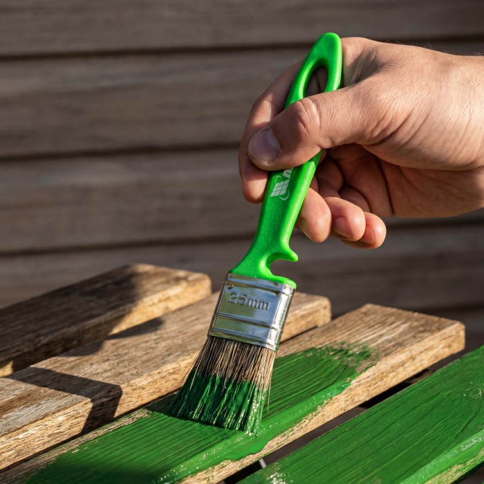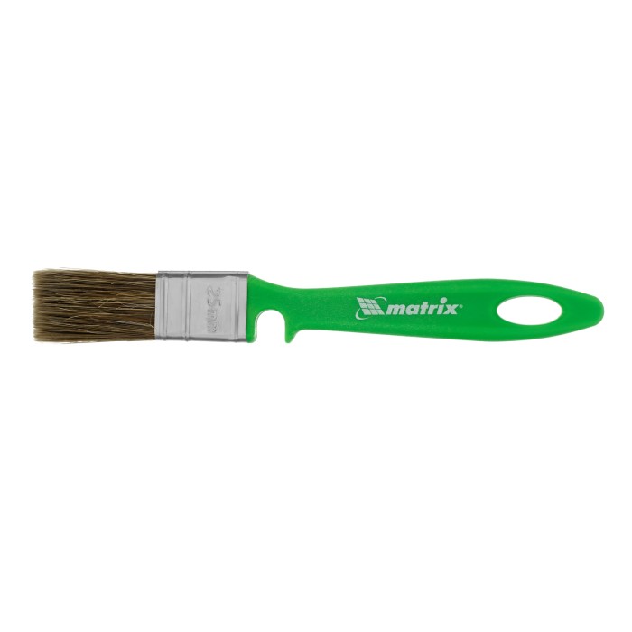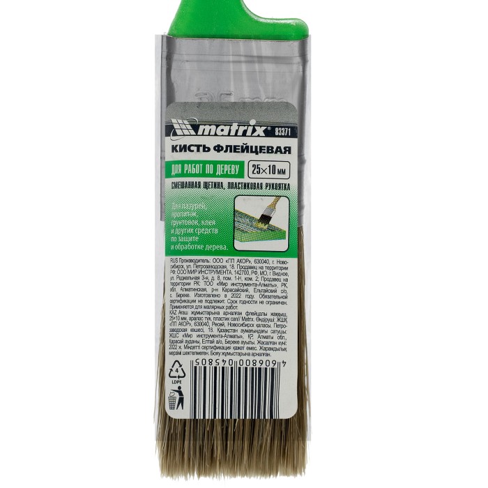 Флейцевая кисть Matrix Color Line «РАБОТЫ ПО ДЕРЕВУ» 83371 шириной 25 мм и толщиной 10 мм используется с любыми видами пропиток, клеев, грунтовок и других деревообрабатывающих составов. Комбинированная щетина расщеплена на кончиках и содержит натуральные волокна, поэтому кисть хорошо впитывает и отдает лакокрасочные материалы. Искусственный ворс предохраняет щетину от деформации при использовании водных составов. Высокая плотность щетины обеспечивает хорошую продуктивность работ.ПреимуществаДолговечность — щетина обладает высокой износостойкостью, клинья не подвержены воздействию воды и агрессивных ЛКМ, антикоррозионное покрытие предохраняет бандаж от разрушения.Возможность интенсивного применения — пластиковые клинья, эпоксидный клей уникальной рецептуры и прочный бандаж обеспечивают надежное скрепление щетины с рукояткой.Эргономичность — удобная рукоятка позволяет долго работать без ощущения усталости.Продуманная форма рукоятки — благодаря специальному вырезу кисть можно закрепить на банке, ведре или ванночке.Хранение в вертикальном положении — в рукоятке предусмотрено отверстие для подвешивания кисти.