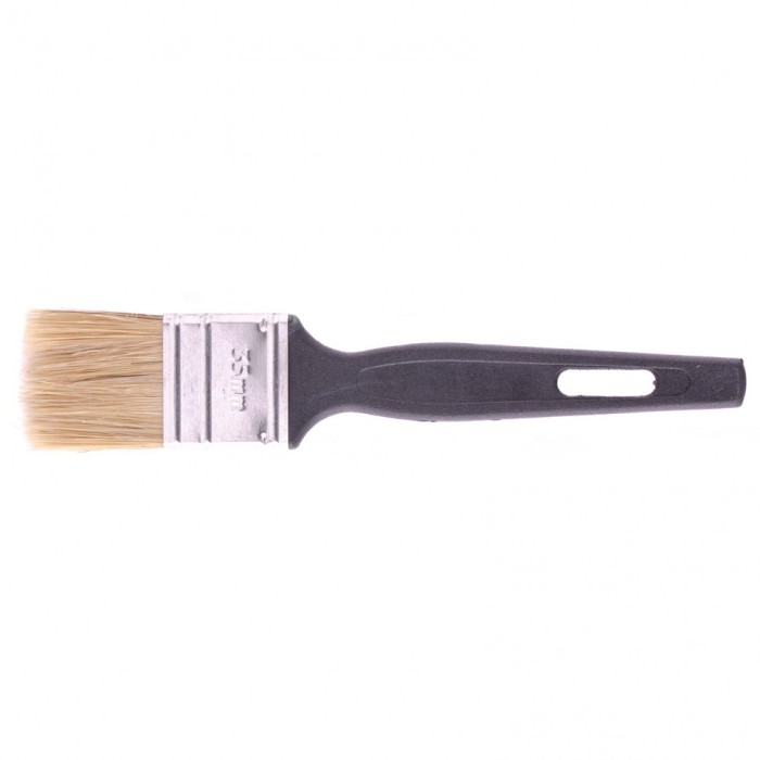 Флейцевая кисть Сибртех «Стандарт» 82503 размером 35 х 6 мм, с натуральной щетиной и пластиковой ручкой, оптимальна для финишной обработки поверхностей и устранения мелких дефектов после использования кистей с более жест...
