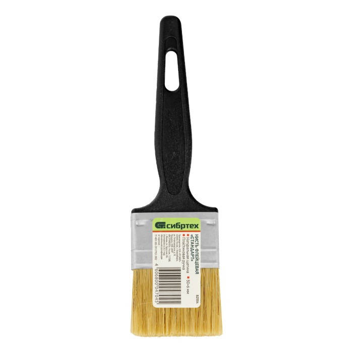 Флейцевая кисть Сибртех «Стандарт» 82504 размером 50 х 6 мм, с натуральной щетиной и пластиковой ручкой, оптимальна для финишной обработки поверхностей и устранения мелких дефектов после использования кистей с более жесткой щетиной. Рабочая часть из свиной щетины с добавлением искусственной устойчива к истиранию и воздействию растворителей.ПреимуществаШирина 50 мм — кисть оптимальна для окрашивания небольших деталей, плинтусов и рам.Высокое качество окрашивания — щетина двойной выварки не содержит жира и посторонних примесей.Эффективная работа — расщепленная на концах щетина хорошо впитывает, удерживает и отдает краску.Долгий срок службы — металлический бандаж надежно фиксирует щетину и не боится воздействия влаги благодаря антикоррозионному покрытию.Эргономичность — пластиковая рукоятка надежно ложится в руку, а отверстие в ней позволяет организовать подвесное хранение.