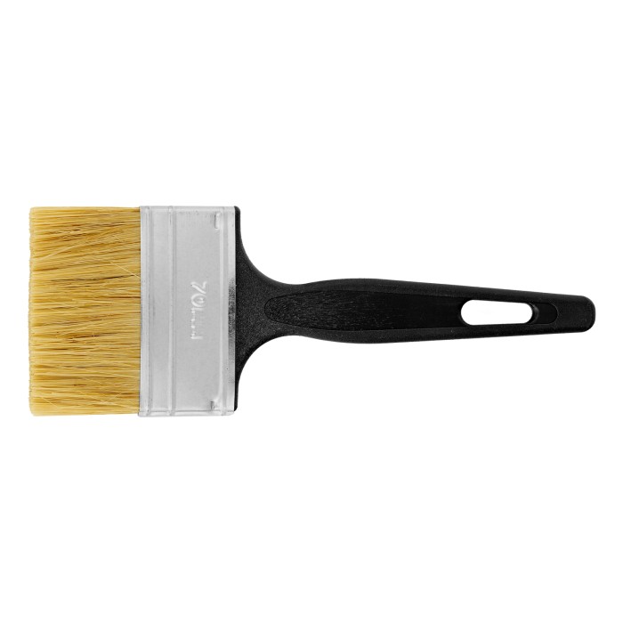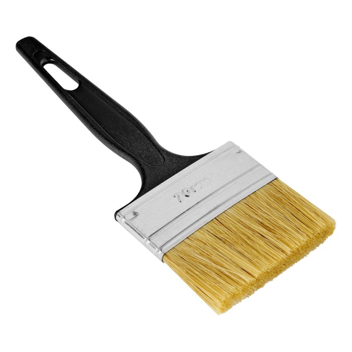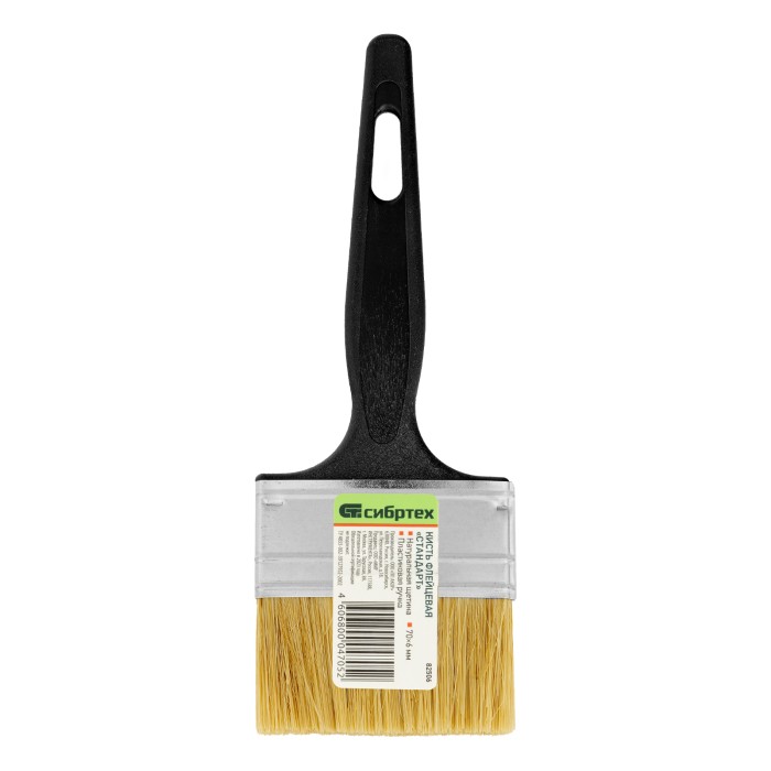 Флейцевая кисть Сибртех «Стандарт» 82506 размером 70 х 6 мм, с натуральной щетиной и пластиковой ручкой, оптимальна для финишной обработки поверхностей и устранения мелких дефектов после использования кистей с более жесткой щетиной. Рабочая часть из свиной щетины с добавлением искусственной устойчива к истиранию и воздействию растворителей.ПреимуществаШирина 70 мм — кисть оптимальна для окрашивания участков большой площади.Высокое качество окрашивания — щетина двойной выварки не содержит жира и посторонних примесей.Эффективная работа — расщепленная на концах щетина хорошо впитывает, удерживает и отдает краску.Долгий срок службы — металлический бандаж надежно фиксирует щетину и не боится воздействия влаги благодаря антикоррозионному покрытию.Эргономичность — пластиковая рукоятка надежно ложится в руку, а отверстие в ней позволяет организовать подвесное хранение.
