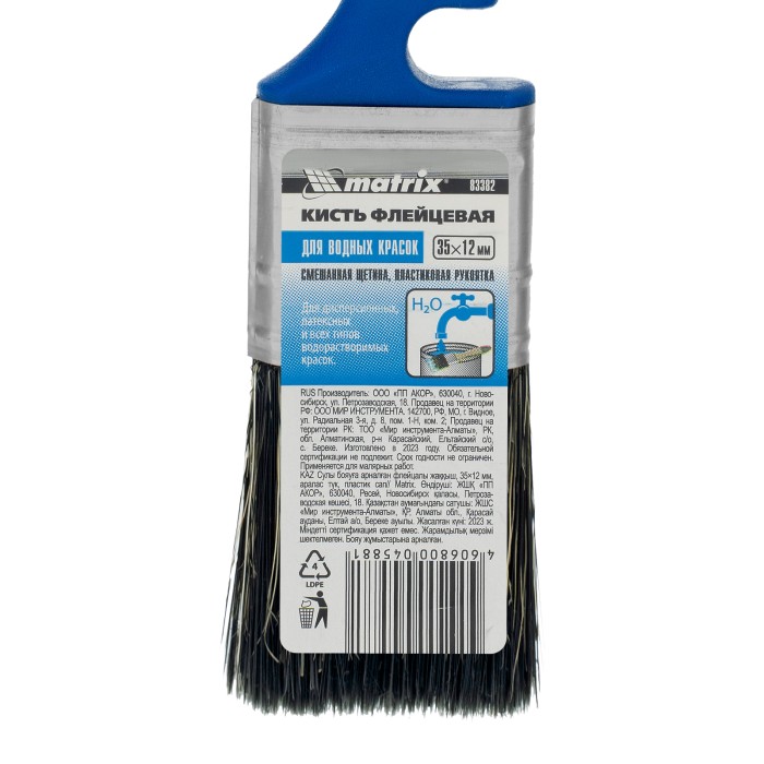 Флейцевая кисть Matrix Color Line «ВОДНЫЕ КРАСКИ» 83382 шириной 35 мм и толщиной 12 мм разработана специально для использования с составами на водной основе, в том числе деревообрабатывающими. Комбинированная щетина оптимальна для работы с водными лакокрасочными материалами — искусственные волокна препятствуют деформации, а натуральные удерживают большой объем краски. Кисть подходит для работы на небольших участках или в труднодоступных местах.ПреимуществаДлительный срок службы — щетина обладает высокой износоустойчивостью.Высокое качество выполняемых работ — кончики щетинок расщеплены для улучшения краскообменных свойств.Надежность — пластиковые клинья не деформируются при контакте с ЛКМ, мытье и замачивании кисти.Антикоррозионное покрытие бандажа — кисть можно надолго замачивать в воде.Комфортная работа — удобная пластиковая рукоятка снижает усталость при длительном использовании.Удобное хранение — специальная форма рукоятки позволяет закрепить инструмент на краю банки или ведра, а отверстие в верхней части служит для подвешивания кисти.