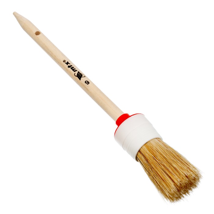 Круглая кисть MTX №6 82076 диаметром 30 мм, с натуральной щетиной и деревянной ручкой, пригодится в быту для окрашивания узких длинных поверхностей. Светлая натуральная свиная щетина с добавлением искусственной обладает высокой износоустойчивостью и может использоваться для нанесения красок с содержанием растворителей, а также масляных красок и лаков.ПреимуществаВысокое качество работ — за счет двойной выварки щетина не содержит включений жира и мелких частиц грязи.Эффективность — щетина расщеплена на концах, что увеличивает способность кисти набирать и отдавать лакокрасочные материалы.Долговечность — пластиковый бандаж надежно фиксирует щетину и не разрушается под воздействием воды, поэтому кисть можно мыть.Комфорт и надежность — рукоятка выполнена из отборной древесины, отшлифована и покрыта защитным лаком.Удобное хранение — в рукоятке предусмотрено отверстие для подвешивания на крючок.