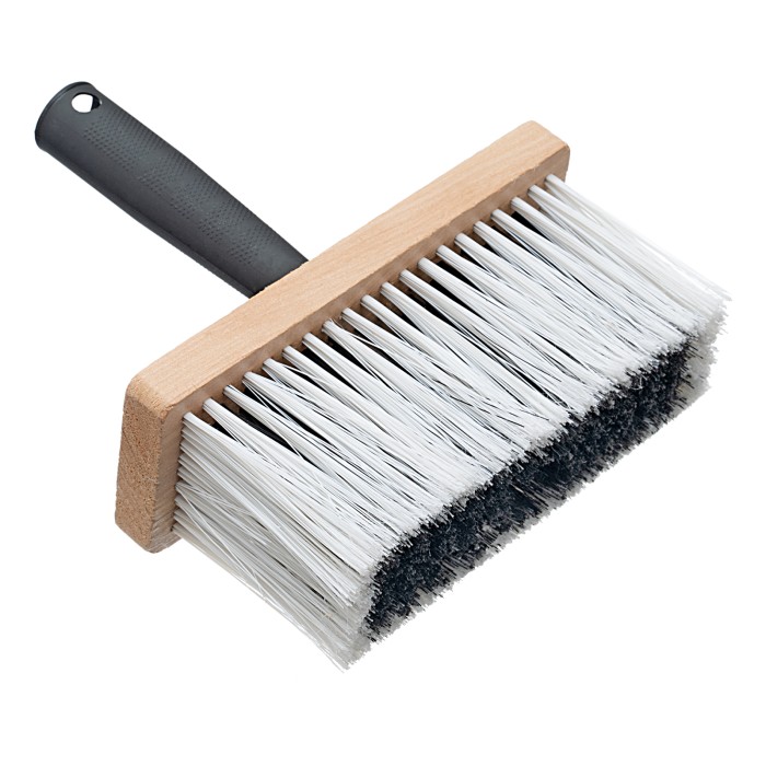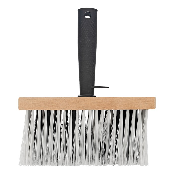 Кисть-макловица MTX 84086 шириной 170 мм и толщиной 70 мм, с искусственной щетиной, деревянным корпусом и пластмассовой ручкой, предназначена для нанесения лакокрасочных материалов и клеевых составов на участки большой площади — стены, потолки, фасады. Искусственный ворс не впитывает воду и устойчив к растворителям, поэтому кисть подходит для работ с грунтовками, лаками, водно-дисперсионными и масляными красками.ПреимуществаВозможность многократного использования — щетина тщательно проклеена и надежно закреплена в деревянном корпусе, поэтому не осыпается во время работы.Эффективное окрашивание — расщепленная на концах щетина способна набирать и равномерно отдавать большой объем лакокрасочного материала.Функциональность — полая рукоятка адаптирована под использование удлиняющих стержней, что позволяет работать на большой высоте и в труднодоступных местах без использования подмостей или стремянки.Эргономичность — при помощи специального выступа на рукоятке кисть можно закрепить на краю ведра, ванночки или банки с краской, отверстие в ручке позволяет подвешивать инструмент на крючок или гвоздь.