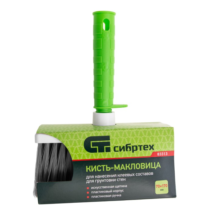 Кисть-макловица Сибртех 83313 толщиной 70 мм и шириной 170 мм, с искусственной щетиной, пластиковым корпусом и пластиковой ручкой, используется для нанесения на поверхности грунтовки, водно-дисперсионной краски, побелки, обойного клея, морилки. Подходит для обработки участков большой площади. Искусственная щетина с расщепленными на концах ворсинками хорошо набирает и удерживает лакокрасочные материалы, не деформируется в ходе работы.ПреимуществаДолговечность — прочный пластиковый корпус не разрушается при контакте с ЛКМ.Полая съемная рукоятка — кисть можно установить на удлиняющий стержень, чтобы обрабатывать поверхности на высоте без использований стремянки или подмостей.Удобство хранения — в рукоятке имеется отверстие для подвешивания.