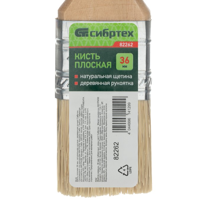 Плоская кисть Сибртех 82262 шириной 36 мм, с натуральной щетиной и деревянной ручкой, понадобится при окрашивании различных поверхностей. Ширина 36 мм делает инструмент оптимальным для окрашивания углов, мелких деталей, плинтусов и рам Свиная натуральная щетина с добавлением искусственной подходит для большинства красок, в том числе масляных и на основе растворителей.ПреимуществаЭффективная работа — расщепленная на концах щетина повышает впитывающую способность кисти и улучшает отдачу краски.Высокое качество щетины — благодаря двойной выварке в ней не содержатся посторонние примеси и жир.Долговечность — металлический бандаж обработан антикоррозийным составом, а значит, кисть можно мыть под водой.Эргономичность — отшлифованная деревянная рукоятка удобно лежит в руке и имеет отверстие для подвесного хранения.Защита от рассыхания — рукоятка покрыта бесцветным лаком.