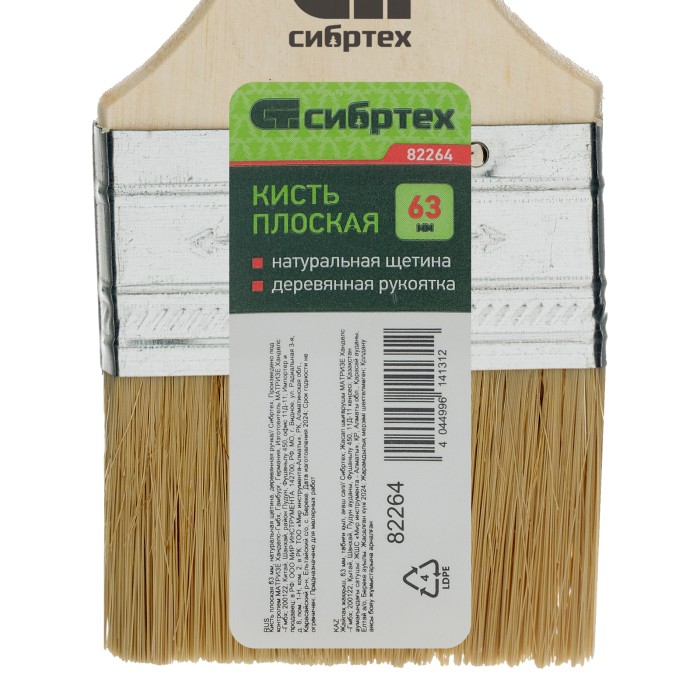 Плоская кисть Сибртех 82264 шириной 63 мм, с натуральной щетиной и деревянной ручкой, понадобится при окрашивании различных поверхностей. Ширина 63 мм делает инструмент оптимальным для окрашивания участков средней площади. Свиная натуральная щетина с добавлением искусственной подходит для большинства красок, в том числе масляных и на основе растворителей.ПреимуществаЭффективная работа — расщепленная на концах щетина повышает впитывающую способность кисти и улучшает отдачу краски.Высокое качество щетины — благодаря двойной выварке в ней не содержатся посторонние примеси и жир.Долговечность — металлический бандаж обработан антикоррозийным составом, а значит, кисть можно мыть под водой.Эргономичность — отшлифованная деревянная рукоятка удобно лежит в руке и имеет отверстие для подвесного хранения.Защита от рассыхания — рукоятка покрыта бесцветным лаком.