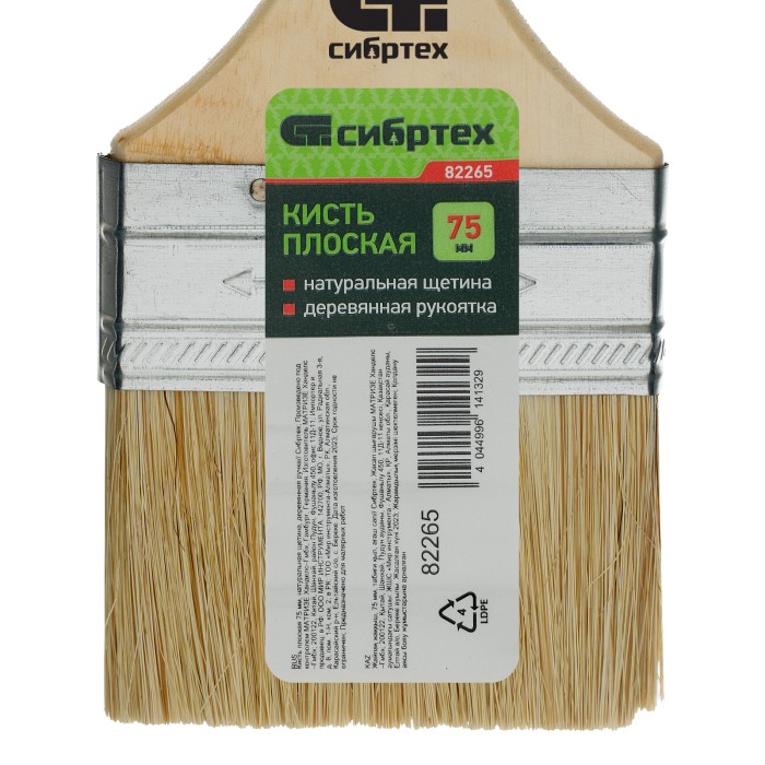 Плоская кисть Сибртех 82265 шириной 75 мм, с натуральной щетиной и деревянной ручкой, понадобится при окрашивании различных поверхностей. Ширина 75 мм делает инструмент оптимальным для окрашивания участков большой площади. Свиная натуральная щетина с добавлением искусственной подходит для большинства красок, в том числе масляных и на основе растворителей.ПреимуществаЭффективная работа — расщепленная на концах щетина повышает впитывающую способность кисти и улучшает отдачу краски.Высокое качество щетины — благодаря двойной выварке в ней не содержатся посторонние примеси и жир.Долговечность — металлический бандаж обработан антикоррозийным составом, а значит, кисть можно мыть под водой.Эргономичность — отшлифованная деревянная рукоятка удобно лежит в руке и имеет отверстие для подвесного хранения.Защита от рассыхания — рукоятка покрыта бесцветным лаком.