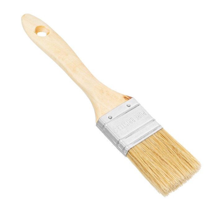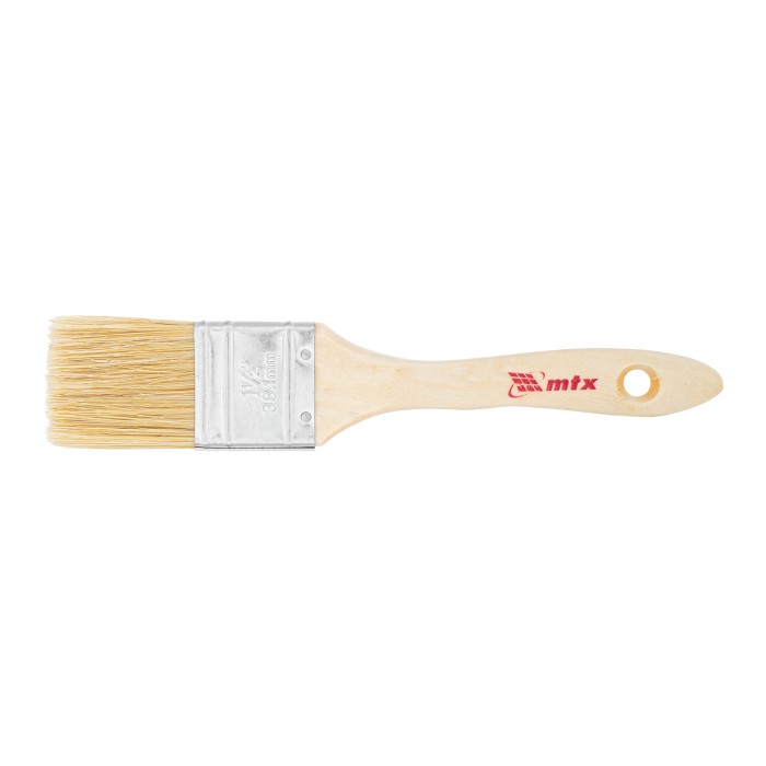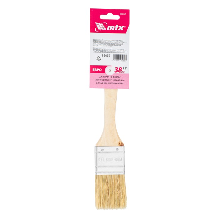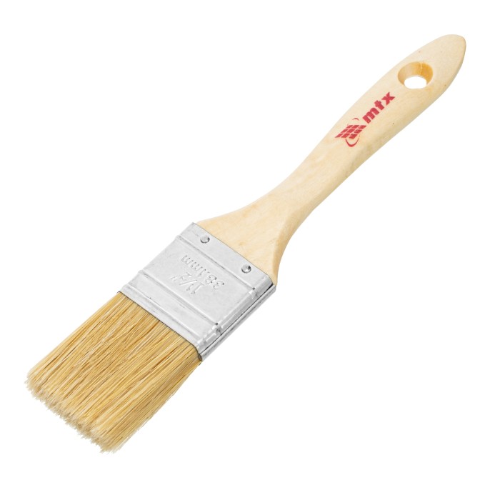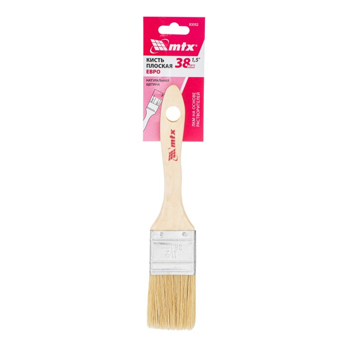Плоская кисть MTX «Евро» 83052 шириной 1,5 дюйма, с натуральной щетиной и деревянной ручкой, используется для профессионального окрашивания поверхностей. Рекомендуется для нанесения агрессивных ЛКМ с содержанием раствори...