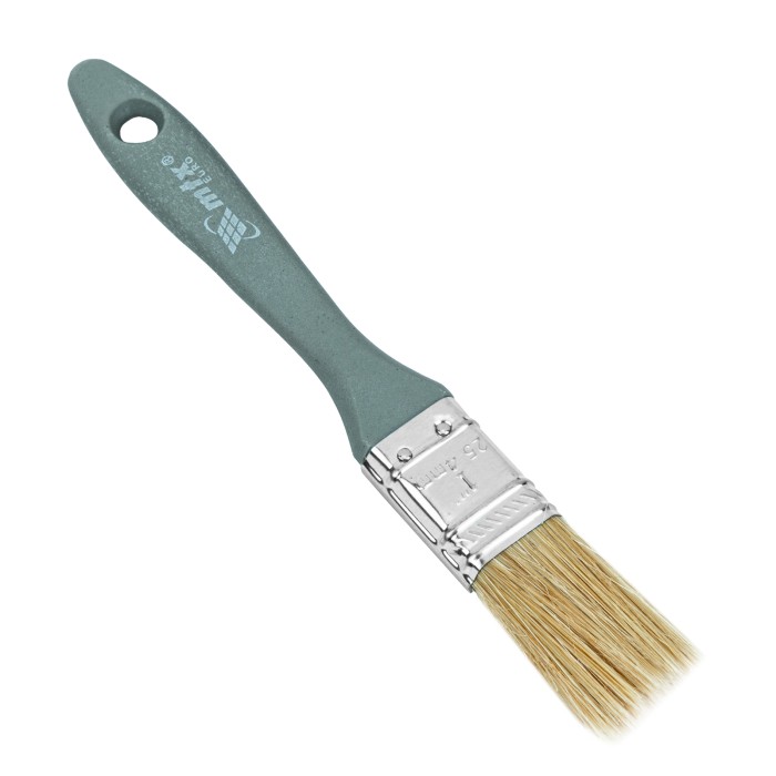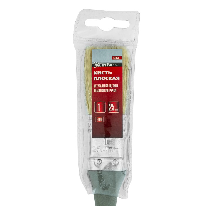 Плоская кисть MTX «Евро» 83061 шириной 1 дюйм, с натуральной щетиной и пластмассовой ручкой, используется для профессионального окрашивания поверхностей. Рекомендуется для нанесения агрессивных ЛКМ с содержанием растворителей. ПреимуществаШирина рабочей части 25 мм — кистью удобно окрашивать труднодоступные участки.Прочность и долговечность — бандаж надежно скрепляет щетину с рукояткой, поэтому кисть выдерживает многократное использование.Высокое качество окрашивания — дважды вываренная щетина не содержит посторонних примесей, а расщепленные кончики увеличивают ее способность впитывать и отдавать краску.Коррозионная стойкость — защитное покрытие предотвращает разрушение бандажа под воздействием влаги.Эргономичность — пластмассовая рукоятка удобно лежит в руке, а специальное отверстие позволяет подвешивать кисть на гвоздь или крючок.