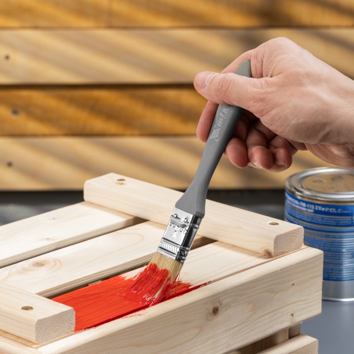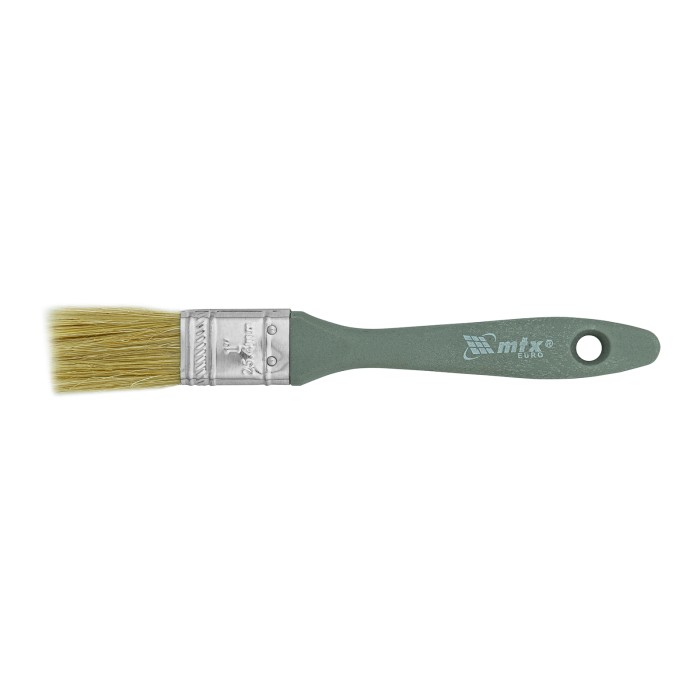 Плоская кисть MTX «Евро» 83061 шириной 1 дюйм, с натуральной щетиной и пластмассовой ручкой, используется для профессионального окрашивания поверхностей. Рекомендуется для нанесения агрессивных ЛКМ с содержанием раствори...