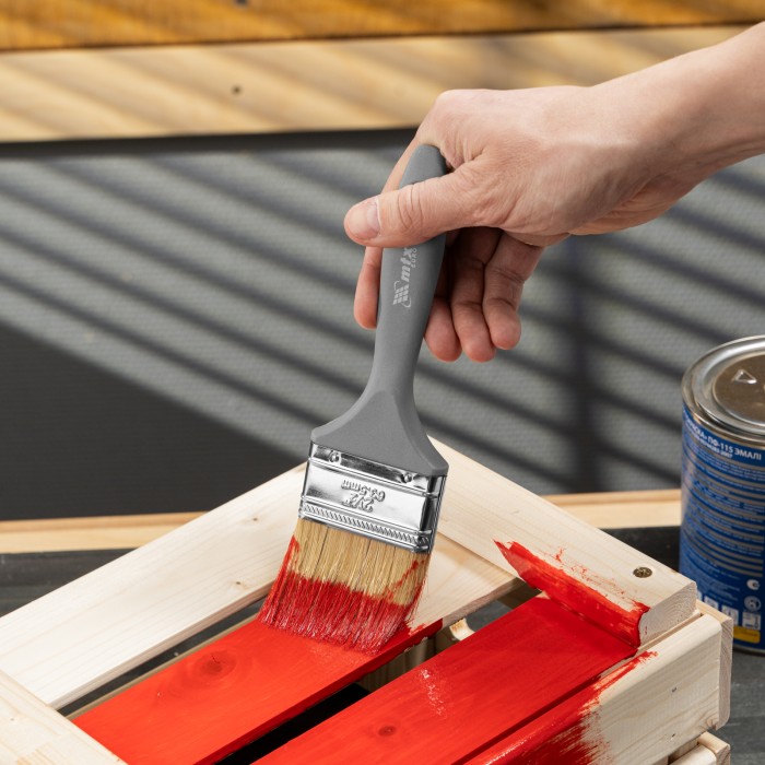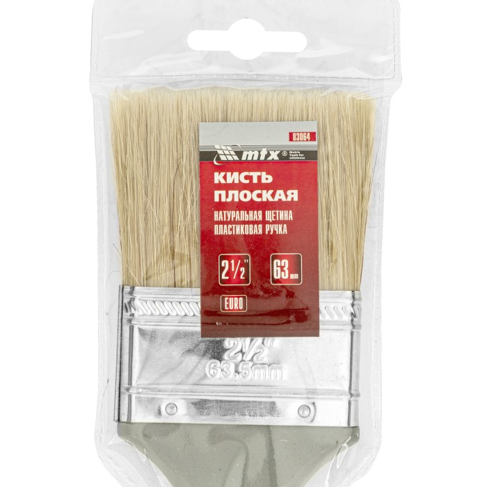 Плоская кисть MTX «Евро» 83064 шириной 2,5 дюйма, с натуральной щетиной и пластмассовой ручкой, используется для профессионального окрашивания поверхностей. Рекомендуется для нанесения агрессивных ЛКМ с содержанием растворителей. ПреимуществаШирина рабочей части 63 мм — кистью удобно окрашивать небольшие участки.Прочность и долговечность — бандаж надежно скрепляет щетину с рукояткой, поэтому кисть выдерживает многократное использование.Высокое качество окрашивания — дважды вываренная щетина не содержит посторонних примесей, а расщепленные кончики увеличивают ее способность впитывать и отдавать краску.Коррозионная стойкость — защитное покрытие предотвращает разрушение бандажа под воздействием влаги.Эргономичность — пластмассовая рукоятка удобно лежит в руке, а специальное отверстие позволяет подвешивать кисть на гвоздь или крючок.