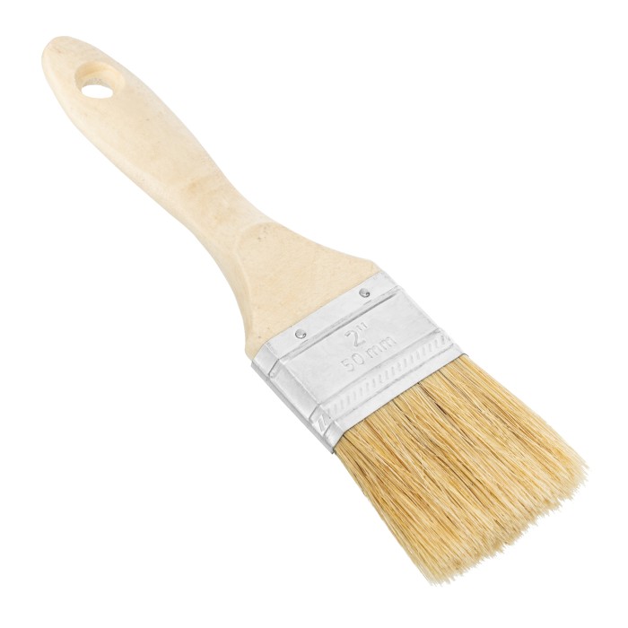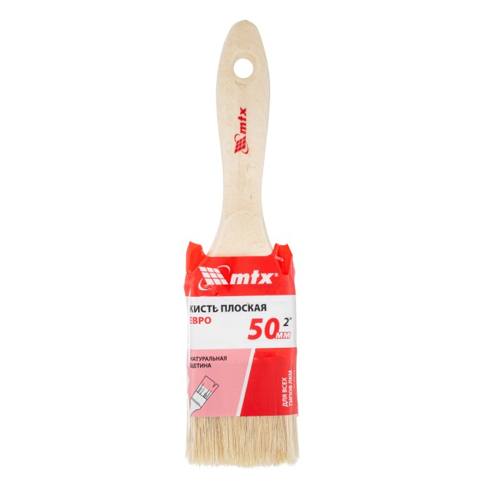 Плоская кисть MTX «Евро» 83053 шириной 2 дюйма, с натуральной щетиной и деревянной ручкой, используется для профессионального окрашивания поверхностей. Рекомендуется для нанесения агрессивных ЛКМ с содержанием растворителей. ПреимуществаШирина рабочей части 50 мм — кистью удобно окрашивать труднодоступные участки.Прочность и долговечность — бандаж надежно скрепляет щетину с рукояткой, поэтому кисть выдерживает многократное использование.Высокое качество окрашивания — дважды вываренная щетина не содержит посторонних примесей, а расщепленные кончики увеличивают ее способность впитывать и отдавать краску.Коррозионная стойкость — защитное покрытие предотвращает разрушение бандажа под воздействием влаги.Эргономичность — отшлифованная и покрытая лаком рукоятка удобно лежит в руке, а специальное отверстие позволяет подвешивать кисть на гвоздь или крючок.