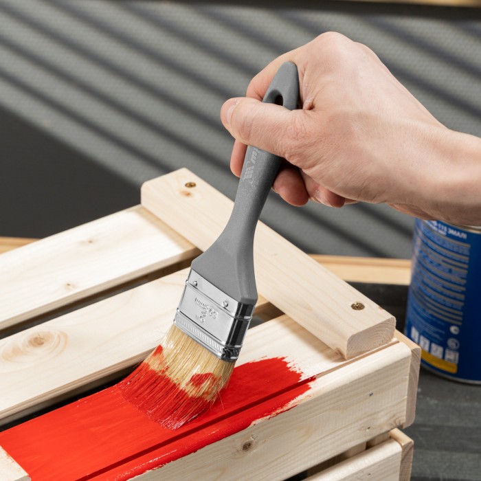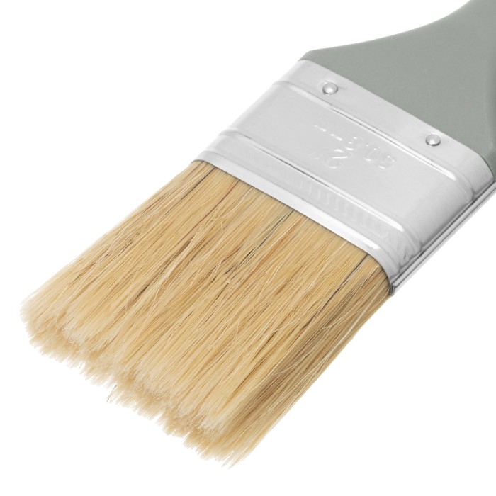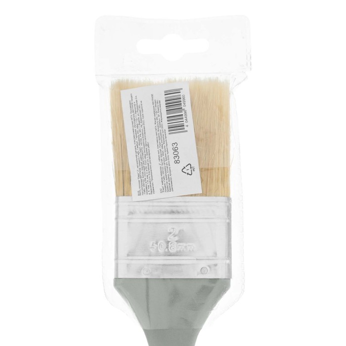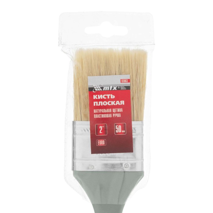 Плоская кисть MTX «Евро» 83063 шириной 2 дюйма, с натуральной щетиной и пластмассовой ручкой, используется для профессионального окрашивания поверхностей. Рекомендуется для нанесения агрессивных ЛКМ с содержанием растворителей. ПреимуществаШирина рабочей части 50 мм — кистью удобно окрашивать труднодоступные участки.Прочность и долговечность — бандаж надежно скрепляет щетину с рукояткой, поэтому кисть выдерживает многократное использование.Высокое качество окрашивания — дважды вываренная щетина не содержит посторонних примесей, а расщепленные кончики увеличивают ее способность впитывать и отдавать краску.Коррозионная стойкость — защитное покрытие предотвращает разрушение бандажа под воздействием влаги.Эргономичность — пластмассовая рукоятка удобно лежит в руке, а специальное отверстие позволяет подвешивать кисть на гвоздь или крючок.