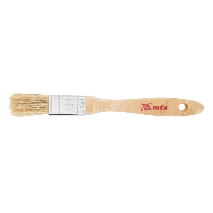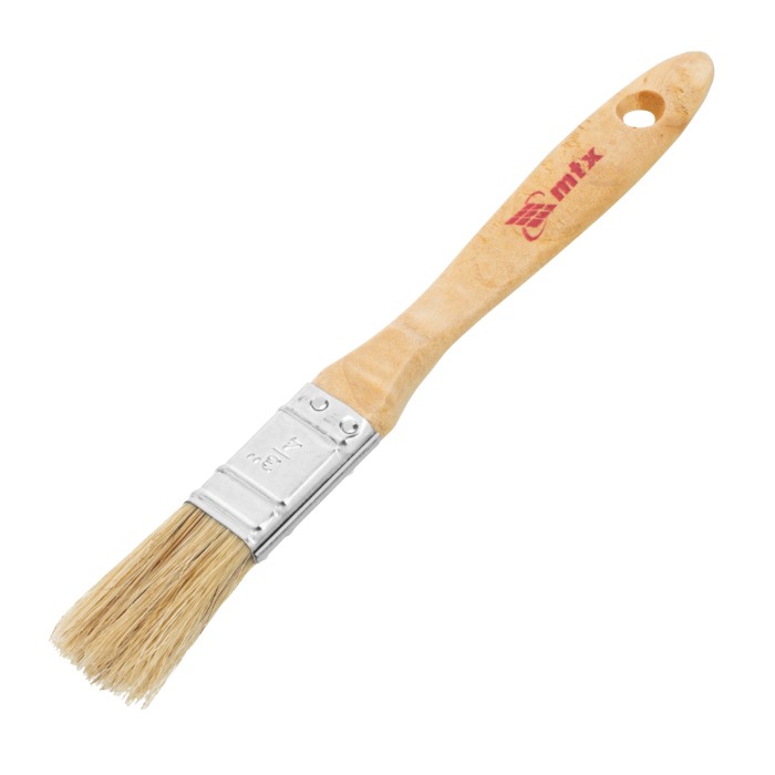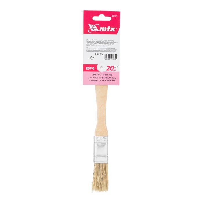 Плоская кисть MTX «Евро» 83050 шириной 3/4 дюйма, с натуральной щетиной и деревянной ручкой, используется для профессионального окрашивания поверхностей. Рекомендуется для нанесения агрессивных ЛКМ с содержанием раствори...