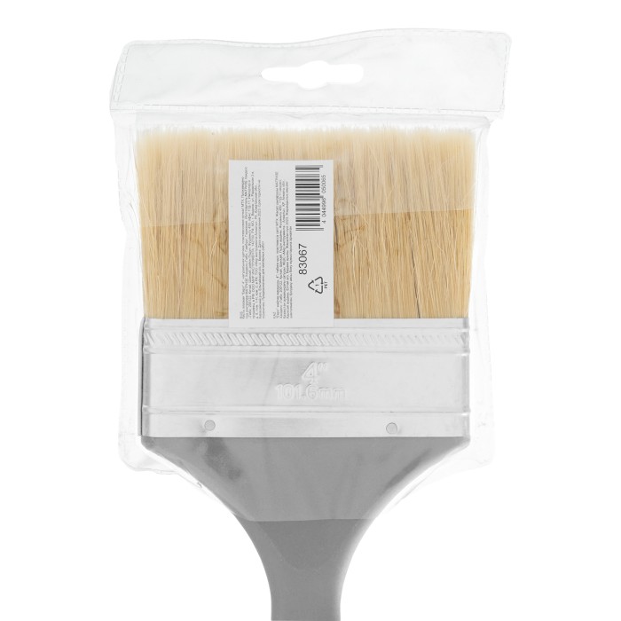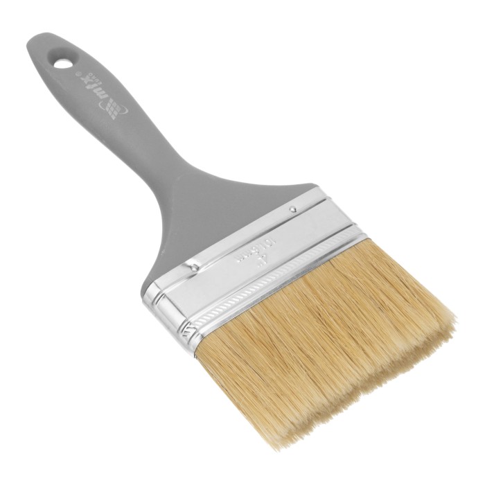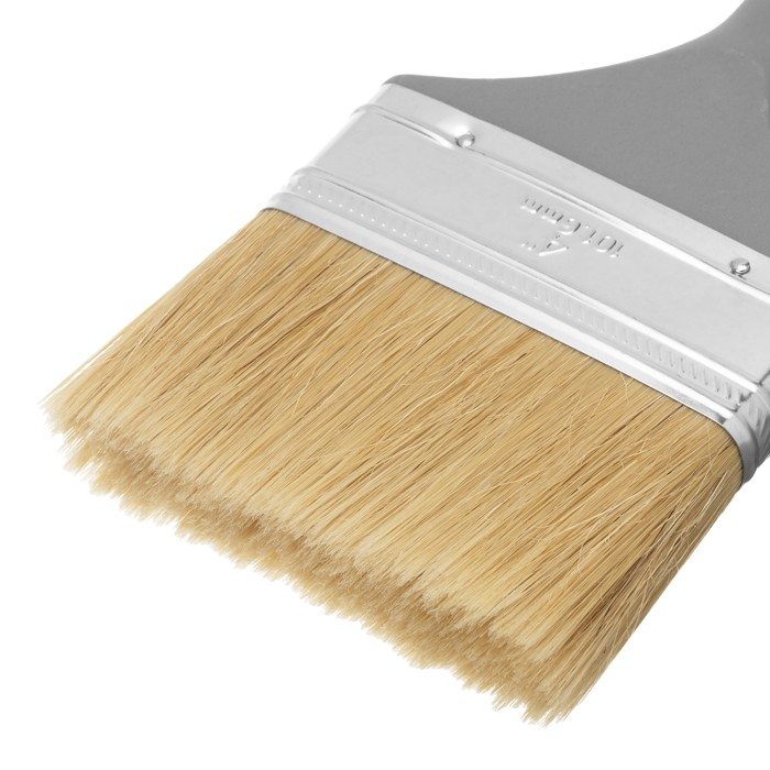 Плоская кисть MTX «Евро» 83067 шириной 4 дюйма, с натуральной щетиной и пластмассовой ручкой, используется для профессионального окрашивания поверхностей. Рекомендуется для нанесения агрессивных ЛКМ с содержанием растворителей. ПреимуществаШирина рабочей части 100 мм — кистью удобно окрашивать участки большой площади.Прочность и долговечность — бандаж надежно скрепляет щетину с рукояткой, поэтому кисть выдерживает многократное использование.Высокое качество окрашивания — дважды вываренная щетина не содержит посторонних примесей, а расщепленные кончики увеличивают ее способность впитывать и отдавать краску.Коррозионная стойкость — защитное покрытие предотвращает разрушение бандажа под воздействием влаги.Эргономичность — пластмассовая рукоятка удобно лежит в руке, а специальное отверстие позволяет подвешивать кисть на гвоздь или крючок.