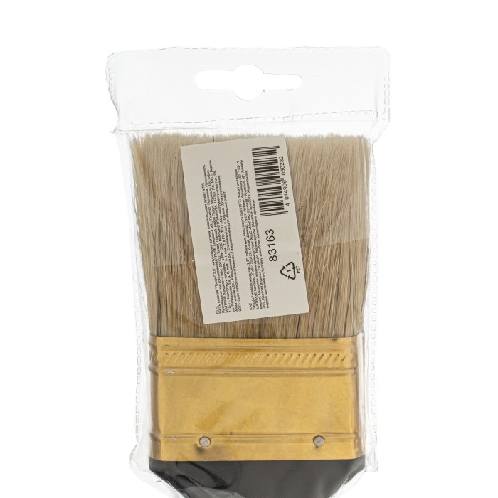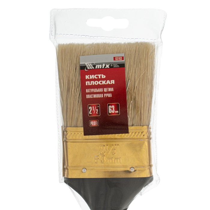 Плоская кисть «Профи» MTX 83163 шириной 2,5 дюйма, с натуральной щетиной и пластмассовой ручкой, рассчитана на профессиональное выполнение малярных работ. Натуральная щетина с увеличенной плотностью набивки подходит для нанесения различных типов ЛКМ, в том числе содержащих растворители. ПреимуществаШирина 63 мм — кисть оптимальна для окрашивания поверхностей небольшой площади.Высокий ресурс — кисть премиум качества легко выдерживает интенсивное и многократное использование.Равномерное окрашивание — щетина двойной выварки не содержит посторонних примесей, а расщепленные кончики обеспечивают высокий показатель впитываемости и отдачи краски.Простой уход — кисть можно мыть, т.к. антикоррозийное покрытие защищает бандаж от разрушения.Комфортная работа — пластмассовая рукоятка удобно ложится в руку.Практичное хранение — в рукоятке имеется отверстие для подвешивания на крючок.