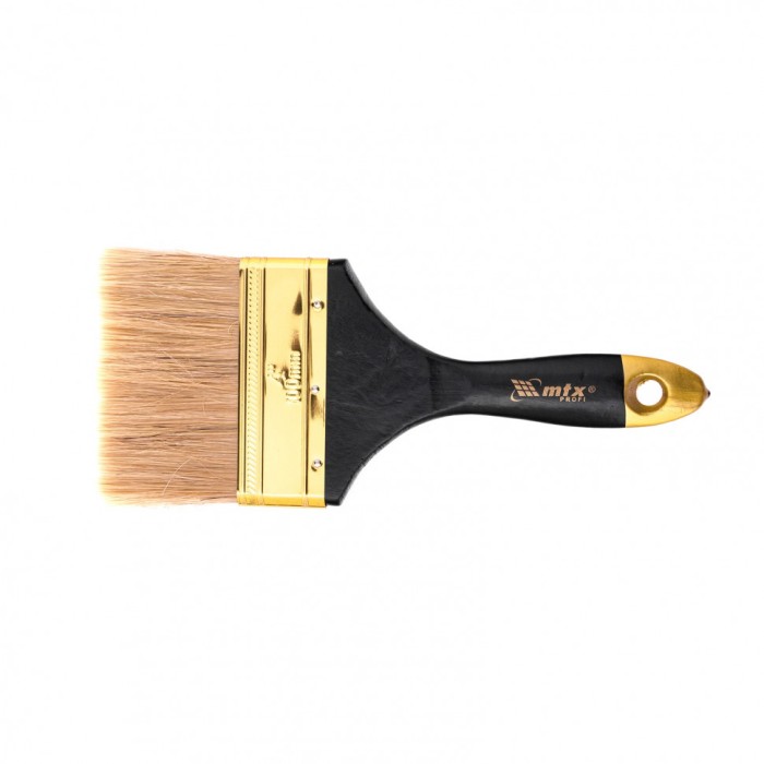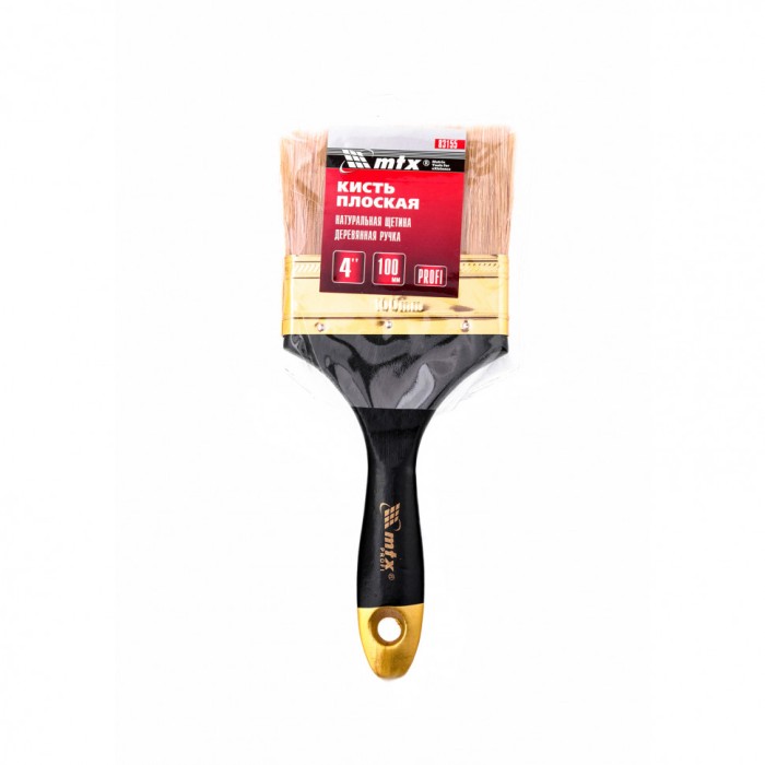 Плоская кисть «Профи» MTX 83155 шириной 4 дюйма, с натуральной щетиной и деревянной ручкой, рассчитана на профессиональное выполнение малярных работ. Натуральная щетина с увеличенной плотностью набивки подходит для нанесения различных типов ЛКМ, в том числе содержащих растворители. ПреимуществаШирина 100 мм — кисть оптимальна для окрашивания поверхностей большой площади.Высокий ресурс — кисть премиум качества легко выдерживает интенсивное и многократное использование.Равномерное окрашивание — щетина двойной выварки не содержит посторонних примесей, а расщепленные кончики обеспечивают высокий показатель впитываемости и отдачи краски.Простой уход — кисть можно мыть, т.к. антикоррозийное покрытие защищает бандаж от разрушения.Комфортная работа — рукоятка из отборной древесины отшлифована и покрыта лаком, поэтому удобно лежит в руке.Практичное хранение — в рукоятке имеется отверстие для подвешивания на крючок.