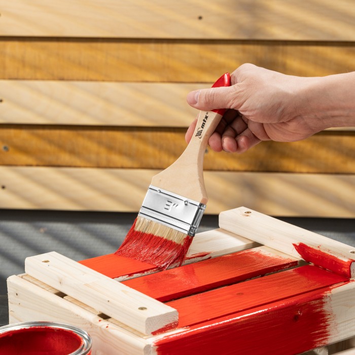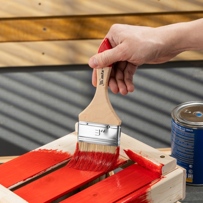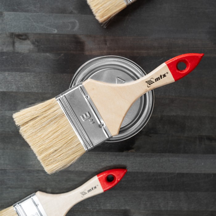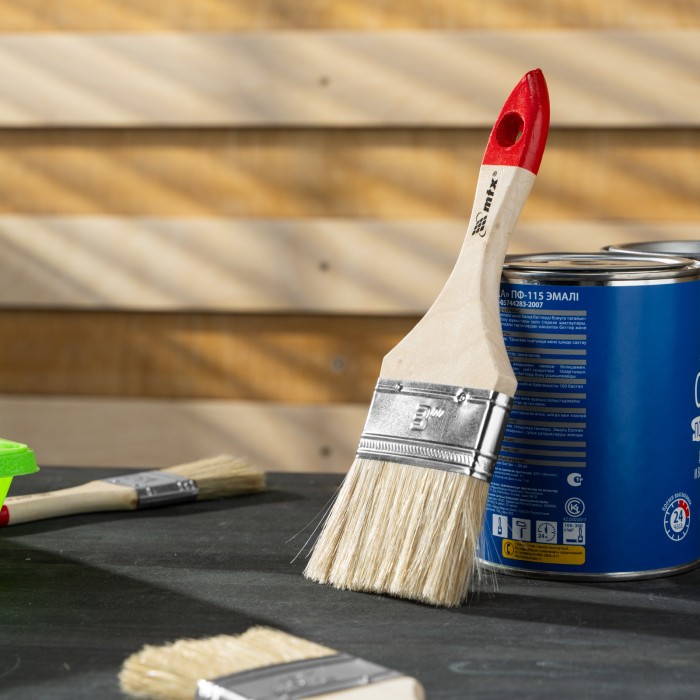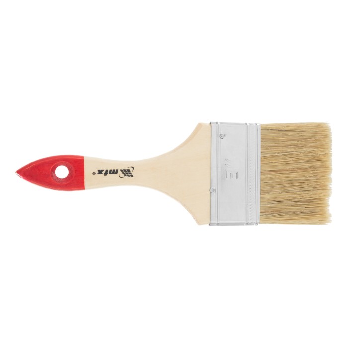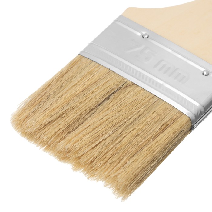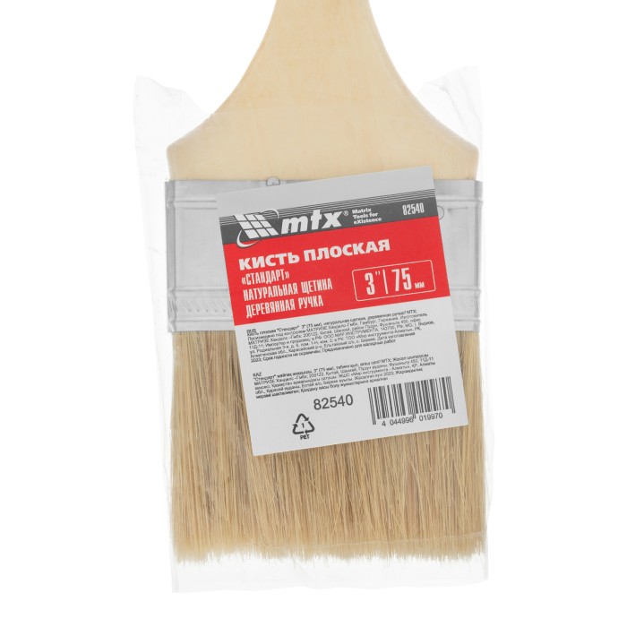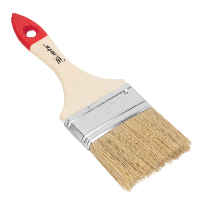 Плоская кисть MTX «Стандарт» 82540 шириной 3 дюйма (75 мм), с натуральной щетиной и деревянной ручкой, — инструмент для проведения бытовых малярных работ. Натуральная светлая щетина обладает высокой износоустойчивостью и подходит для нанесения красок на основе растворителей. За счет ширины 75 мм кисть подходит для окрашивания участков большой площади.ПреимуществаВысококачественное исполнение — благодаря металлическому бандажу щетина надежно закреплена и не выпадает при интенсивном использовании.Эффективная работа — расщепленная на концах щетина с высокой впитывающей и отдающей способностью обеспечивает равномерное нанесение краски.Защита от разрушения — бандаж с антикоррозийным покрытием устойчив к воздействию воды и ЛКМ, а лакированная рукоятка не рассыхается.Эргономичность — отшлифованная деревянная рукоятка с утолщением в зоне захвата надежно ложится в руку.Удобное хранение — кисть с отверстием в рукоятке можно подвешивать на крючок или гвоздь.