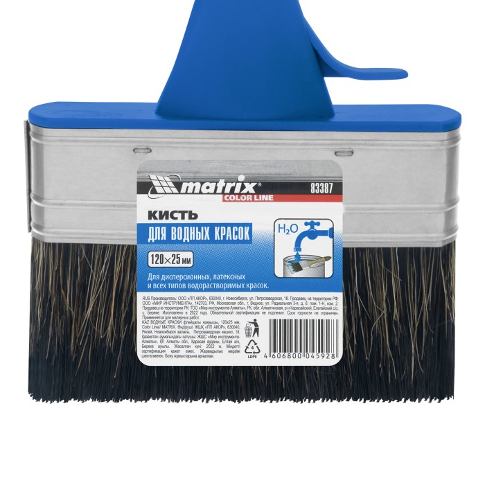 Плоская кисть Matrix Color Line «ВОДНЫЕ КРАСКИ» 83387 шириной 120 мм и толщиной 25 мм разработана специально для использования с составами на водной основе, в том числе деревообрабатывающими. Комбинированная щетина оптимальна для работы с водными лакокрасочными материалами — искусственные волокна препятствуют деформации, а натуральные удерживают большой объем краски.ПреимуществаДлительный срок службы — щетина обладает высокой износоустойчивостью.Высокое качество выполняемых работ — кончики щетинок расщеплены для улучшения краскообменных свойств.Надежность — пластиковые клинья не деформируются при контакте с ЛКМ, мытье и замачивании кисти.Антикоррозионное покрытие бандажа — кисть можно надолго замачивать в воде.Комфортная работа — удобная пластиковая рукоятка снижает усталость при длительном использовании.Удобное хранение — специальная форма рукоятки позволяет закрепить инструмент на краю банки или ведра, а отверстие в верхней части служит для подвешивания кисти.