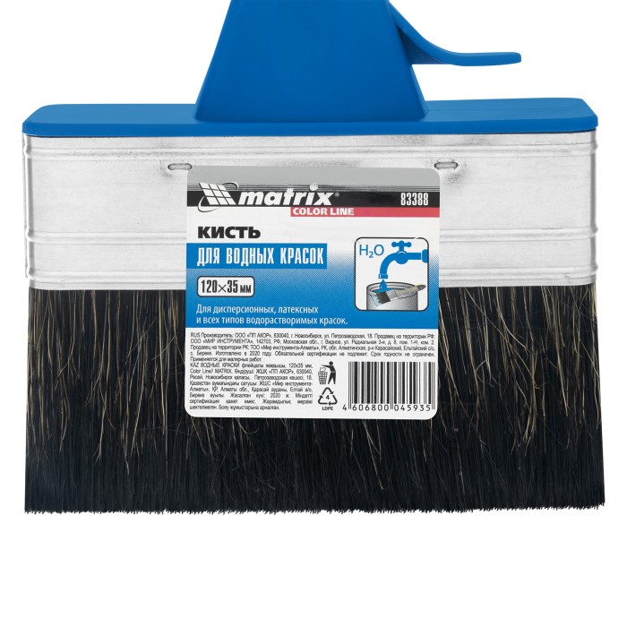 Плоская кисть Matrix Color Line «ВОДНЫЕ КРАСКИ» 83388 шириной 120 мм и толщиной 35 мм разработана специально для использования с составами на водной основе, в том числе деревообрабатывающими. Комбинированная щетина оптимальна для работы с водными лакокрасочными материалами — искусственные волокна препятствуют деформации, а натуральные удерживают большой объем краски.ПреимуществаДлительный срок службы — щетина обладает высокой износоустойчивостью.Высокое качество выполняемых работ — кончики щетинок расщеплены для улучшения краскообменных свойств.Надежность — пластиковые клинья не деформируются при контакте с ЛКМ, мытье и замачивании кисти.Антикоррозионное покрытие бандажа — кисть можно надолго замачивать в воде.Комфортная работа — удобная пластиковая рукоятка снижает усталость при длительном использовании.Удобное хранение — специальная форма рукоятки позволяет закрепить инструмент на краю банки или ведра, а отверстие в верхней части служит для подвешивания кисти.