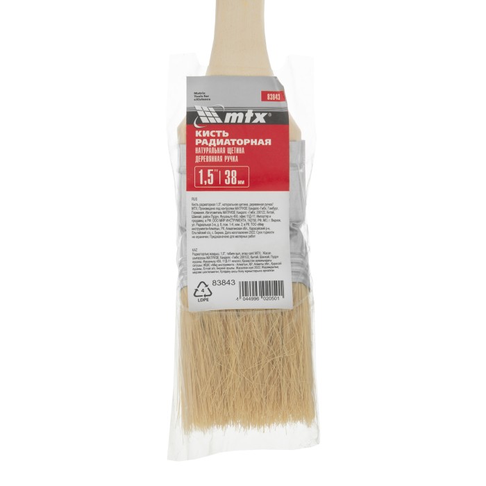 Радиаторная кисть MTX 83843 шириной 1,5", с натуральной щетиной и деревянной ручкой, используется для окрашивания радиаторов водяного отопления, металлических проволочных конструкций, труб, а также углов и стыков стен. Решение этих задач облегчает удлиненная ручка изогнутой формы. Натуральная щетина устойчива к агрессивным средам, поэтому кисть может применяться с эмалями и масляными красками.Преимущества:Высокое качество выполняемых работ — благодаря щетине с расщепленными кончиками кисть хорошо удерживает и распределяет краску, финишный слой получается ровным и гладким.Устойчивость к нагрузкам — щетина не выпадает, т. к. она надежно закреплена клеем, клиньями и металлическим бандажом.Возможность замачивания — защитное покрытие предохраняет бандаж от образования ржавчины.Комфортная работа — рукоятка из отборной древесины не выскальзывает из руки.Практичность — отверстие в рукоятке служит для подвешивания кисти и упрощает хранение.