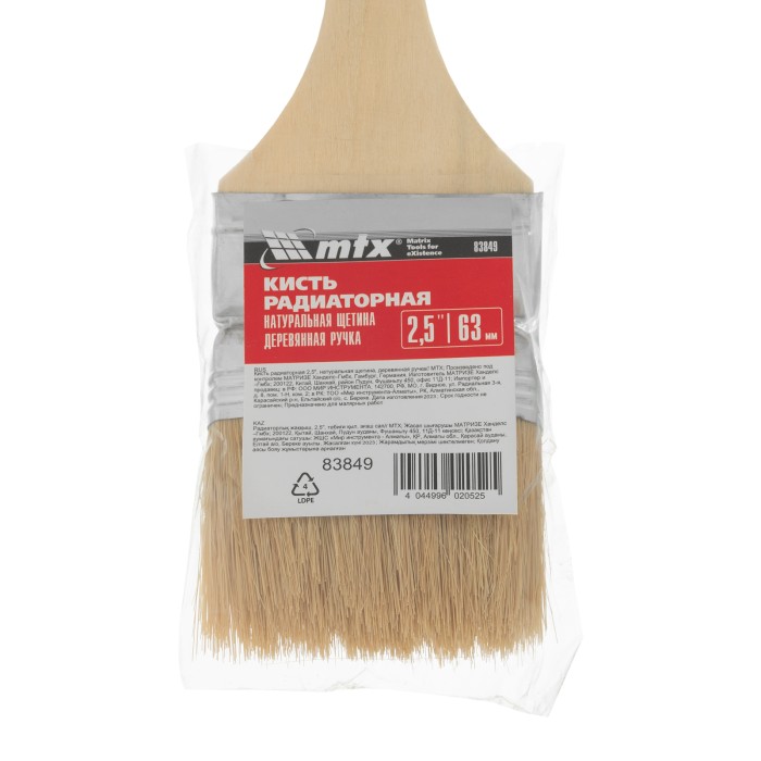 Радиаторная кисть MTX 83849 шириной 2,5", с натуральной щетиной и деревянной ручкой, используется для окрашивания радиаторов водяного отопления, металлических проволочных конструкций, труб, а также углов и стыков стен. Решение этих задач облегчает удлиненная ручка изогнутой формы. Натуральная щетина устойчива к агрессивным средам, поэтому кисть может применяться с эмалями и масляными красками.Преимущества:Высокое качество выполняемых работ — благодаря щетине с расщепленными кончиками кисть хорошо удерживает и распределяет краску, финишный слой получается ровным и гладким.Устойчивость к нагрузкам — щетина не выпадает, т. к. она надежно закреплена клеем, клиньями и металлическим бандажом.Возможность замачивания — защитное покрытие предохраняет бандаж от образования ржавчины.Комфортная работа — рукоятка из отборной древесины не выскальзывает из руки.Практичность — отверстие в рукоятке служит для подвешивания кисти и упрощает хранение.