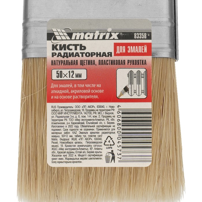 Радиаторная кисть Matrix Color Line «ЭМАЛИ» 83358 шириной 50 мм и толщиной 12 мм предназначена для работы с эмалями, в том числе на акриловой, алкидной основе, а также на основе растворителя. Натуральная щетина устойчива к износу и воздействию агрессивных жидкостей, а благодаря расщепленным концам хорошо впитывает и отдает краску. Высокая плотность щетины позволяет получить качественное покрытие. Удлиненная рукоятка удобна для работы в труднодоступных местах.ПреимуществаРавномерное окрашивание — натуральная светлая щетина двойной выварки хорошо удерживает и распределяет краску.Долговечность — щетина надежно закреплена с помощью тщательно подобранной эпоксидной смолы, клиньев и бандажа, пластиковые клинья не деформируются при мытье или замачивании.Защита от разрушения — на бандаж нанесено антикоррозийное покрытие.Эргономичность — форма рукоятки продумана таким образом, чтобы мастер не уставал даже при длительной работе.Удобное хранение — в рукоятке имеется отверстие для подвешивания кисти на крючок или гвоздь.