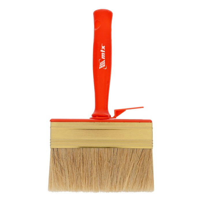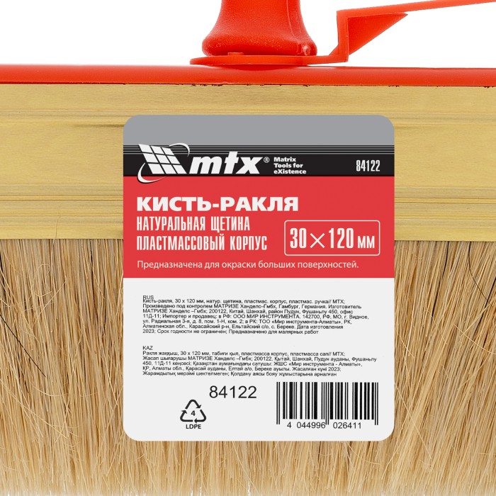 Кисть-ракля MTX 84122 толщиной 30 мм и шириной 120 мм, с натуральной щетиной, пластмассовыми корпусом и ручкой, используется для малярных работ на участках большой площади, поэтому удобна для обработки стен, потолков и ф...