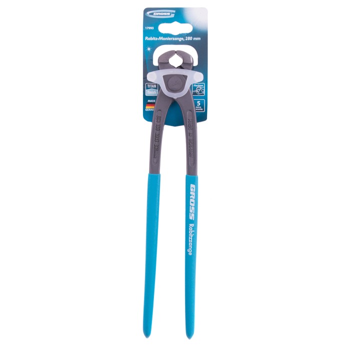 Торцевые клещи Gross 17993 длиной 280 мм, с обливными рукоятками, используются во время строительных, монтажных, ремонтных работ. С их помощью можно вытягивать гвозди и шпильки, сгибать и перекусывать стальную проволоку, прутки, а также решать другие задачи. Инструмент пригодится частным мастерам и профессионалам.ПреимуществаВысокая прочность и долговечность — клещи изготовлены из конструкционной стали С1050, режущие кромки дополнительно закалены до необходимой твердости.Устойчивость к воздействию влаги — антикоррозийное покрытие Titan finish защищает инструмент от разрушения.Комфортная работа — обливные рукоятки с прорезиненным покрытием поглощают вибрации и не выскальзывают из ладони.Высокое качество — производитель предоставляет гарантию на заводской брак сроком на 5 лет.