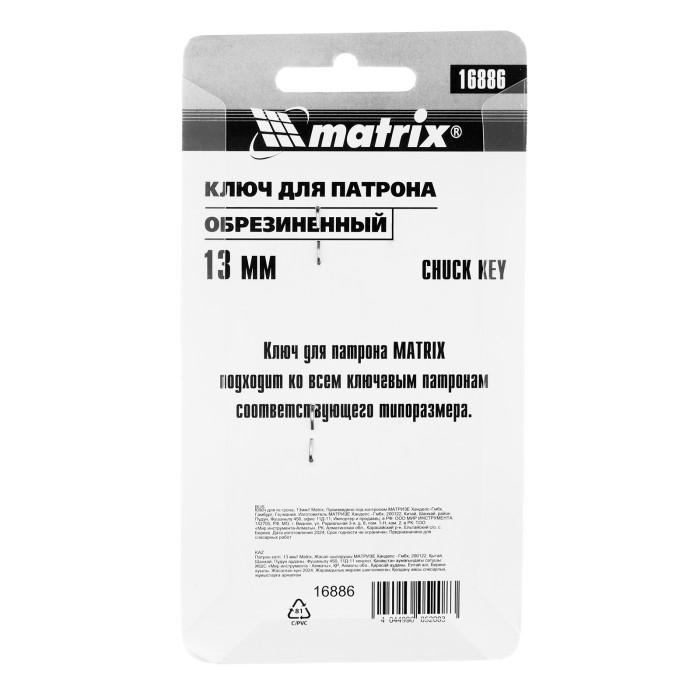 Ключ для патрона 13 мм Matrix 16886 обеспечивает надежную фиксацию оснастки в зажимном механизме сверлильного патрона. Пригодится как профессиональному строителю, так и домашнему мастеру.ПреимуществаВысокая прочность — корпус изготовлен из конструкционной стали.Эргономичность — ключ Г-образной формы позволяет прикладывать меньше усилий при установке сверла.Комфортное использование — благодаря пластиковому покрытию ключ не выскальзывает из руки.Удобная упаковка — изделие поставляется в блистере, позволяющем осмотреть его перед покупкой.