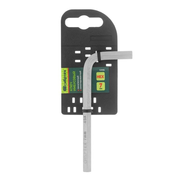 Ключ имбусовый никелированный Сибртех 12334 размером 7 мм, из закаленной стали 45Х, используется для монтажа и демонтажа резьбового крепежа с шестигранным шлицем HEX. Пригодится для сборки мебели, ремонта велосипедов, ре...