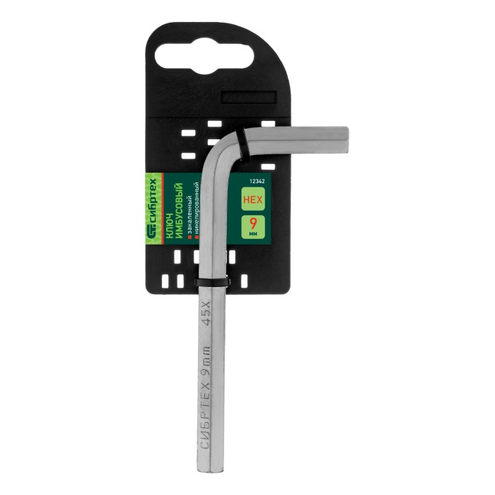Ключ имбусовый никелированный Сибртех 12342 размером 9 мм, из закаленной стали 45Х, используется для монтажа и демонтажа резьбового крепежа с шестигранным шлицем HEX. Пригодится для сборки мебели, ремонта бытовой техники...