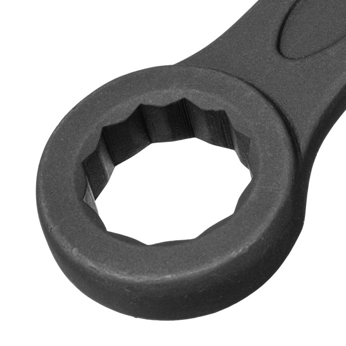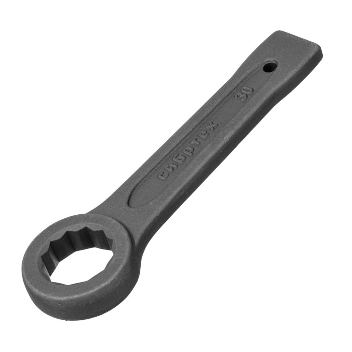 Ключ кольцевой ударный Сибртех 14273 позволяет откручивать и закручивать резьбовые соединения размером 30 мм. Благодаря 12-гранному профилю надежно удерживает головку крепежа. Удобен для работы в ограниченном пространстве — для перестановки его достаточно повернуть на 30°. Инструмент применяется в слесарных мастерских, будет полезен во время ремонта, а также для решения бытовых задач.ПреимуществаЭффективная работа с туго затянутым крепежом — одна сторона ключа утолщена и предназначена для ударных воздействий.Устойчивость к нагрузкам — инструмент изготовлен из прочной углеродистой стали 45.Долговечность — при производстве использована технология фосфатирования, обеспечивающая устойчивость к коррозии.