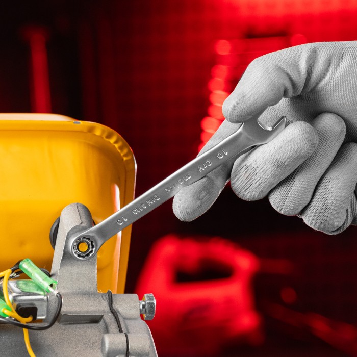 Комбинированный ключ Matrix 15106 размером 10 мм, из стали CrV, с покрытием «матовый хром», пригодится во время ремонтных работ дома или в гараже. С его помощью можно быстро монтировать и демонтировать крепежные элементы. Угол наклона кольцевого зева относительно плоскости инструмента составляет 15°, поэтому ключом удобно работать в труднодоступных местах.ПреимуществаВысокая деформационная стойкость — ключ изготовлен из хромованадиевой стали, а рабочая часть закалена до твердости 45 HRC.Защита от разрушения — матовое хромовое покрытие предотвращает образование коррозии.Аккуратная работа — накидные части с 12-гранным профилем охватывают всю поверхность крепежа, уменьшая риск деформации его граней.