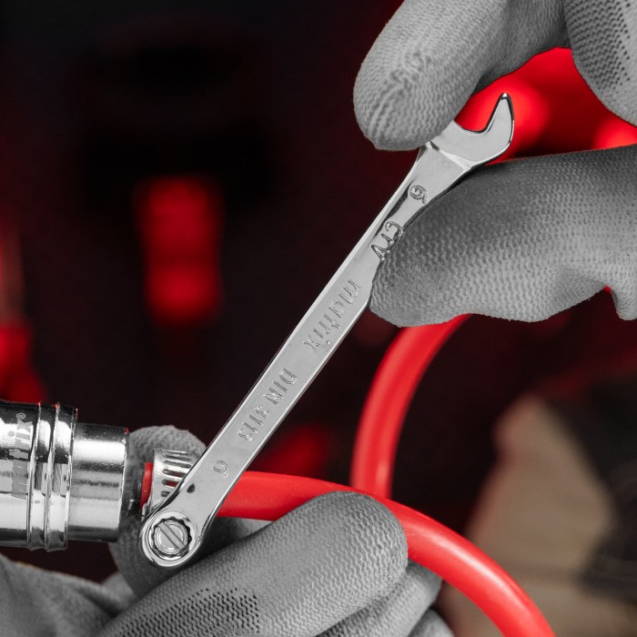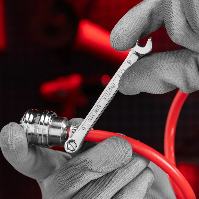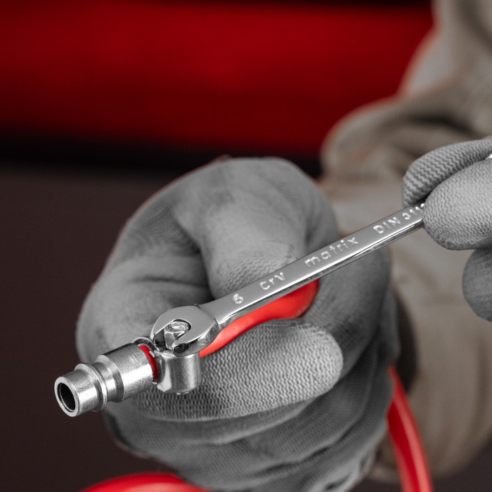 Комбинированный ключ Matrix 15150 размером 6 мм, из стали CrV, с покрытием «полированный хром», пригодится во время ремонтных работ дома или в гараже. С его помощью можно быстро монтировать и демонтировать крепежные элементы. Угол наклона кольцевого зева относительно плоскости инструмента составляет 15°, поэтому ключом удобно работать в труднодоступных местах.ПреимуществаВысокая деформационная стойкость — ключ изготовлен из хромованадиевой стали, а рабочая часть закалена до твердости 45 HRC.Защита от разрушения — полированное хромовое покрытие предотвращает образование коррозии.Аккуратная работа — накидные части с 12-гранным профилем охватывают всю поверхность крепежа, уменьшая риск деформации его граней.