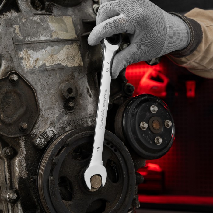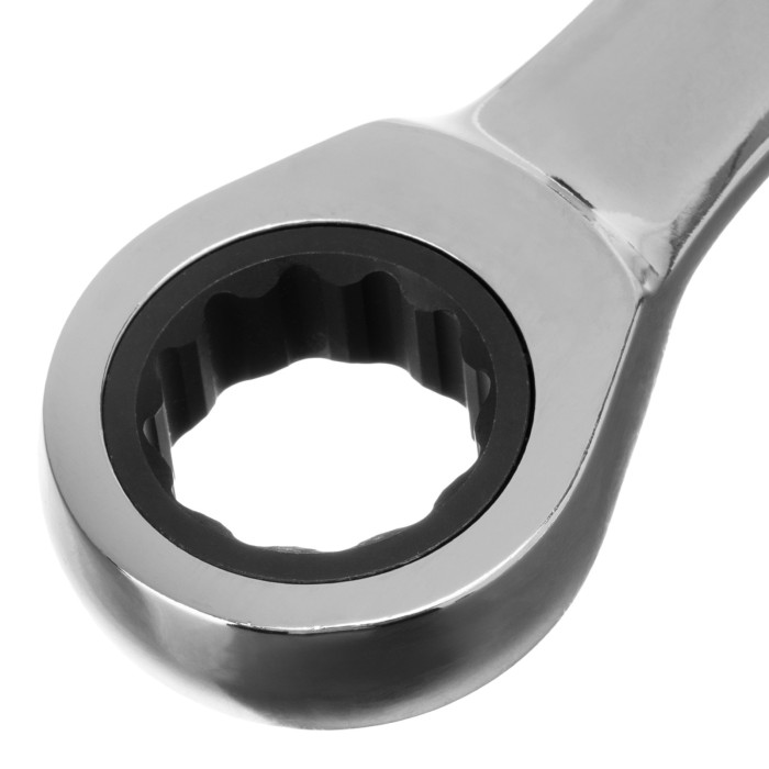 Комбинированный трещоточный ключ Matrix 14811 из стали CrV, с покрытием «зеркальный хром», размером 18 мм, позволяет быстро откручивать и закручивать болты и гайки. Рожковую часть удобно использовать там, где нет возможности полного охвата детали, а трещоточный механизм повышает удобство работы в труднодоступных местах.ПреимуществаПрочность — ключ из высококачественной стали 40CrV с храповым механизмом твердостью 58 HRC легко выдерживает интенсивные нагрузки.Коррозионная стойкость — зеркальное хромоникелевое покрытие защищает инструмент от воздействия влаги.Аккуратная работа — накидная часть с 12-гранным профилем полностью охватывает головку крепежа, что снижает риск деформации ее граней.